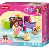 Stavebnice pro holky. Figurka se zástěrou v kuchyňském koutě – stoleček, dřez, poličky, košík s potravinami, sporák a domácí popelnice.