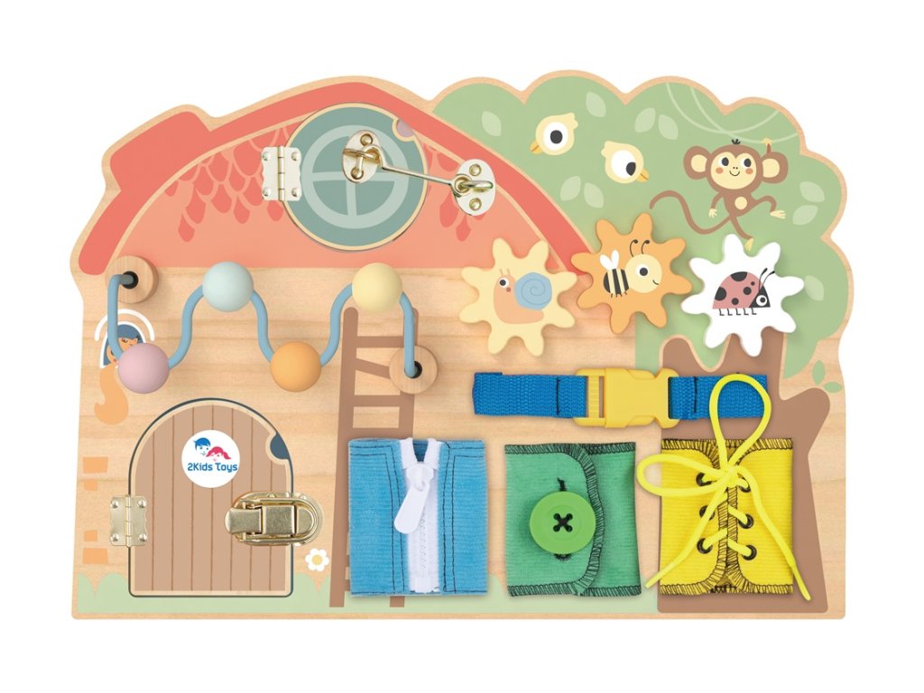 Od zámku ke tkaničkám! Tato hrací deska s obrázky zvířátek přináší spoustu zábavy, díky které bude moci Vaše dítě rozvíjet svou zručnost, zvídavost a zejména jemnou motoriku. Zámky, labyrint, zip, tkaničky a další aktivity dávají dítěti možnost procvičovat různé vázaní, spojování, otáčení či otevírání a připravit se tak na úkony každodenního života. Hrací deska je vyrobena ze dřeva s certifikací FSC®. Hlavní vlastnosti: podporuje nezávislost, jemnou motoriku a koordinaci ruka-okopodněcuje kreativní myšlení a představivostsenzorická stimulaceedukace skrze hruvyrobeno ze dřeva s certifikací FSC® Značka a certifikát FSC® (Forest Stewardship Council) zaručuje, že dřevo, ze kterého byl produkt vyroben, nebylo vytěženo nelegálně a pochází z lesů obhospodařovaných šetrným či přírodě blízkým způsobem, ve kterém jsou dodržovány přísné environmentální a sociální požadavky. Značka FSC® na výrobku znamená, že svým nákupem pomáháte chránit lesy a podporujete šetrné, odpovědné či přírodě blízké hospodaření, díky kterému jsou naše lesy stabilnější, zdravější, mají přirozenou druhovou skladbu a lépe odolávají negativním následkům klimatických změn.