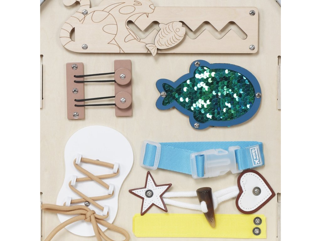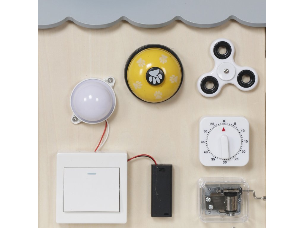 Od tkaniček až po hrající telefon! Tento nádherný interaktivní domeček je inspirovaný principy Montessori a přináší dětem nekonečné možnosti objevování a učení se hrou. Každá jeho strana nabízí nové dobrodružství, které rozvíjí jemnou motoriku, trpělivost, zvídavost a schopnost řešit problémy. Děti zde najdou různé druhy zámků, západek a háčků, které po odemknutí odhalí tajemná dvířka, spinner k roztočení, otočnou minutku, funkční vypínač se světýlkem, či barevný labyrint s rybičkou. Xylofon s paličkou seznámí děti s prvními tóny a rytmem, zatímco hodiny naučí porozumět času. Nechybí ani hrajicí telefon jenž Vás zabaví nejrůznějšími zvuky i veselými melodiemi! Domeček uvnitř svítí. Motivuje děti k samostatnému objevování, učí je trpělivosti a koncentraci a zároveň je připravuje na každodenní činnosti běžného života prostřednictvím praktického tréninku. Poskytuje bezpečné a podnětné prostředí, ve kterém si děti hravou formou rozvíjejí dovednosti nezbytné pro samostatnost. Kombinace přírodního dřeva s příjemnými barvami spolu s kvalitním provedením dělají z této hračky pěkný doplněk každého pokojíčku nebo herny. Domeček se dodává složený v krabici. Hlavní vlastnosti: funkční světýlko a hrající telefondomeček uvnitř svítídodání ve složeném stavuvčetně paličky ke xylofonupodporuje samostatnost, jemnou motoriku a koordinaci ruka-okopodněcuje kreativní myšlení a rozvoj představivostisenzorická stimulaceedukace prostřednictvím hryinspirováno Montessoripřipravuje děti na každodenní činnosti běžného životana napájení souží LR44 knoflíková baterie a 4xAAA baterie (nejsou součástí balení)vhodné pro děti od 3 let