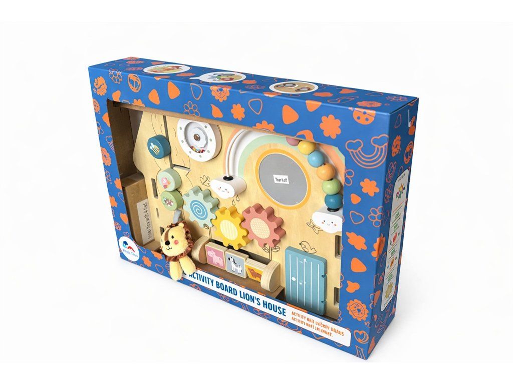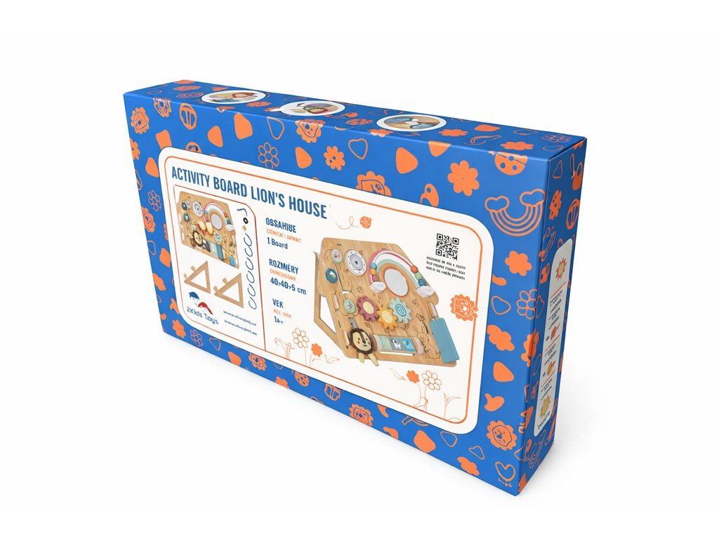 Tato hrací deska ve tvaru domečku s motivem lvíčka přináší spoustu zábavy, díky které bude moci Vaše dítě rozvíjet zručnost, zvídavost a jemnou motoriku. Různé aktivity jako je korálkový labyrint, ozubená kolečka, otáčecí a posuvné destičky s obrázky zvířátek a další dávají dítěti možnost procvičovat otáčení, otevírání či zavírání a připravit se tak na úkony každodenního života. Jemné barvy, roztomilé obrázky, zvuky, jako je chrastění perliček, a rozdílné textury povrchů stimulují smyslové vnímaní dětí. Deska je opatřena praktickými podpěrami ve tvaru trojúhelníku a je vyrobena ze dřeva s certifikací FSC®. Hlavní vlastnosti: podporuje jemnou motoriku a koordinaci ruka-okopodněcuje představivostsenzorická stimulacevyrobeno ze dřeva s certifikací FSC® vhodné od 1 roku věku Značka a certifikát FSC® (Forest Stewardship Council) zaručuje, že dřevo, ze kterého byl produkt vyroben, nebylo vytěženo nelegálně a pochází z lesů obhospodařovaných šetrným či přírodě blízkým způsobem, ve kterém jsou dodržovány přísné environmentální a sociální požadavky. Značka FSC® na výrobku znamená, že svým nákupem pomáháte chránit lesy a podporujete šetrné, odpovědné či přírodě blízké hospodaření, díky kterému jsou naše lesy stabilnější, zdravější, mají přirozenou druhovou skladbu a lépe odolávají negativním následkům klimatických změn.