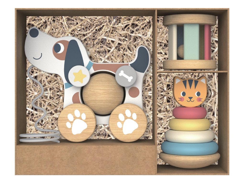 S touto sadou zábavných motorických hraček se Vaše dítě rozhodně nudit nebude! Pejsek na provázku se stane nerozlučným kamarádem každého dítěte při jeho prvních samostatných krůčcích a procházkách. Válec při otáčení díky kuličce uvnitř vydává chrastivý zvuk a stimuluje tak sluch. A díky nasazovacím kroužkům na tyč s motivem kočičky si děti procvičí jemnou motoriku, koordinaci ruka oko a učí se rozpoznávat barvy. Hračky jsou vyrobeny ze dřeva s certifikací FSC® a opatřeny netoxickými barvami v jemných odstínech v kombinaci s barvou přírodního dřeva. Hlavní vlastnosti: sada 3 hračekrozvíjí jemnou motoriku a koordinaci ruka-okoučí rozpoznávat barvyvyrobeno ze dřeva s certifikací FSC® vhodné jako dárekod 1 roku věku Značka a certifikát FSC® (Forest Stewardship Council) zaručuje, že dřevo, ze kterého byl produkt vyroben, nebylo vytěženo nelegálně a pochází z lesů obhospodařovaných šetrným či přírodě blízkým způsobem, ve kterém jsou dodržovány přísné environmentální a sociální požadavky. Značka FSC® na výrobku znamená, že svým nákupem pomáháte chránit lesy a podporujete šetrné, odpovědné či přírodě blízké hospodaření, díky kterému jsou naše lesy stabilnější, zdravější, mají přirozenou druhovou skladbu a lépe odolávají negativním následkům klimatických změn.