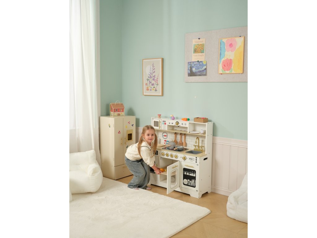 Tato velká dětská kuchyňka je ideální hračkou pro všechny malé kuchaře a kuchařky, kteří milují vaření a chtějí objevovat svět kulinářských dobrodružství. Moderní design v elegantní kombinaci šedé barvy a zlatých doplňků doplňují realistické spotřebiče a bohaté příslušenství, které dětem umožní rozvíjet kreativitu, samostatnost a hru na role.Kuchyňka má pevnou konstrukci ve tvaru obdélníku a nelze ji výškově nastavovat. Na bočních stranách jsou praktické otvory pro snadné nadzvednutí a přemístění celé kuchyňky. Děti zde najdou varnou desku se svítícími plotýnkami, které lze zapínat a vypínat, a také cvakavé otočné knoflíky, které dodávají hře reálný zvukový efekt.Součástí kuchyňky je mikrovlnná trouba s otevíracími dvířky (tlačítka jsou pouze dekorativní), pečicí trouba a myčka nádobí, které fungují jako úložné skříňky. Nechybí ani kávovar, dřez s otočným kohoutkem a prostorná lednice s funkčním výrobníkem ledu. Po vložení dvou kostek ledu do horní části stačí přiložit skleničku zepředu a zatlačit ji směrem dozadu a ledové kostky opravdu spadnou dovnitř, což je oblíbená funkce všech dětí.Kuchyňka je doplněna bohatým příslušenstvím, které zahrnuje hrnec s pokličkou, pánvičku, prkénko, kuchyňské náčiní v podobě 3 kusů vařeček, 2 talířky, 2 hrníčky, skleničku, solničku, pepřenku, dvě kostky „ledu“ a hodiny s otočnými ručičkami. Díky tomu mají malí kuchaři vše potřebné k přípravě i servírování svých kuchařských výtvorů. Hlavní vlastnosti: cvakavý zvuk při otáčení knoflíkůsvítící plotýnky varné desky (lze zapnout/vypnout)otevírací dvířka spotřebičůfunkční výrobník ledu se dvěma kostkamibohaté příslušenství pro hru na vařenírůzné odkládací a úložné prostorymoderní design v šedé barvě se zlatými doplňkyrozvíjí kreativitu, sociální dovednosti a dlouhotrvající hru na rolevyrobeno z FSC® certifikovaného dřeva2xAA baterie nejsou součástí balení Značka a certifikát FSC® (Forest Stewardship Council) zaručuje, že dřevo, ze kterého byl produkt vyroben, nebylo vytěženo nelegálně a pochází z lesů obhospodařovaných šetrným či přírodě blízkým způsobem, ve kterém jsou dodržovány přísné environmentální a sociální požadavky. Značka FSC® na výrobku znamená, že svým nákupem pomáháte chránit lesy a podporujete šetrné, odpovědné či přírodě blízké hospodaření, díky kterému jsou naše lesy stabilnější, zdravější, mají přirozenou druhovou skladbu a lépe odolávají negativním následkům klimatických změn.