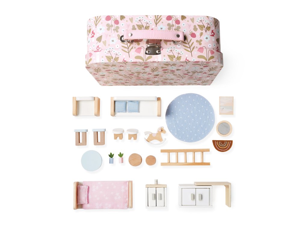 Představte si kouzelný svět, který se vejde do ruky. Malý domeček pro panenky ukrytý v elegantním kufříku. Perfektní na cesty, hraní doma i na návštěvě u babičky. Tento originální kufříkový domeček se po otevření promění v útulné obydlí pro panenky, plné detailních dekorací, drobných nábytkových prvků a místností. V kufříku najdete vše, co Vaše malé společnice potřebují. Houpacího koníka, postýlku, pohovku, křeslo, žebřík do patra a další miniaturní nábytek a dekorace pro Vaše panenky. Tvořte si vlastní scénky a příběhy v tomto malém domečku. Hlavní vlastnosti: stylové doplňky miniaturní nábytek a dekorace pro pohodlný život malých panenekpřenosný kufřík, který slouží zároveň jako domeček podporuje fantazii při hře s panenkamisnadno přenositelný, ideální na výlety, návštěvy nebo dovolenou