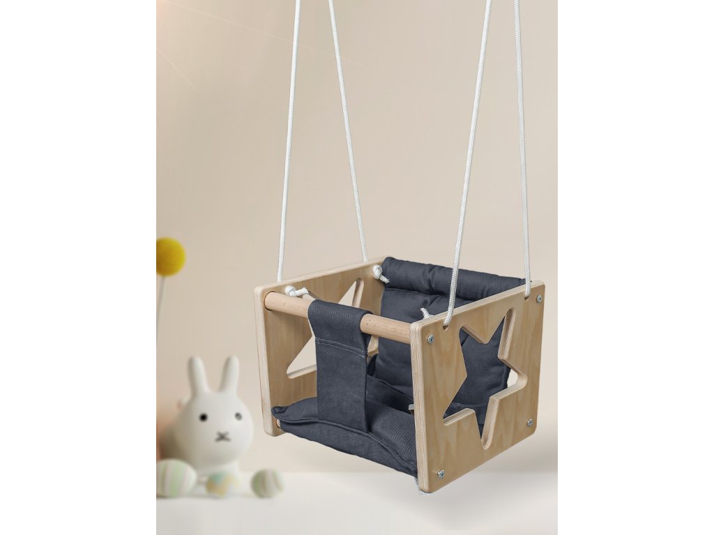 Tato dětská houpačka z kombinovaného bukového-březového dřeva a sedátka ze 100% bavlny Vám nesmí chybět! Moderní minimalistický design s prvkem hvězdy a barevné spojení tmavě šedé s přírodním dřevem je vskutku brilantní - hodí se do každého ex/interiéru! Lana se 2 karabinami jsou výškově nastavitelná (až 180 cm). Hlavní vlastnosti: nosnost 60 kgvýškově nastavitelné lano (max. 180 cm)vyrobeno ze 100% bavlnymoderní design s hvězdou