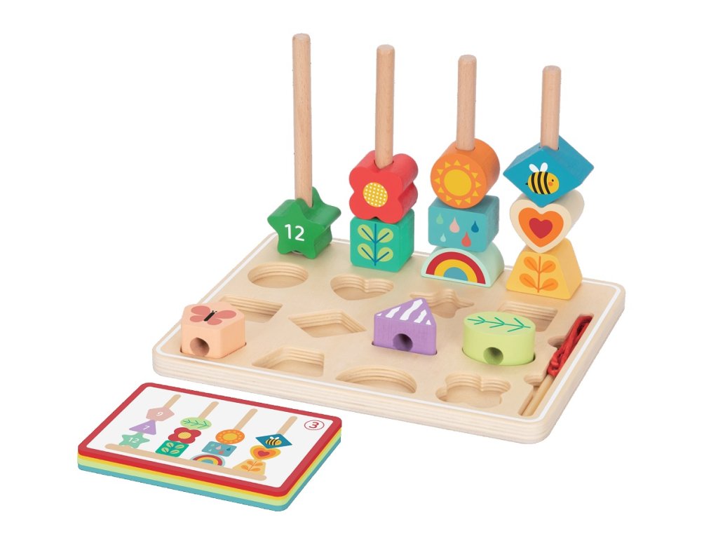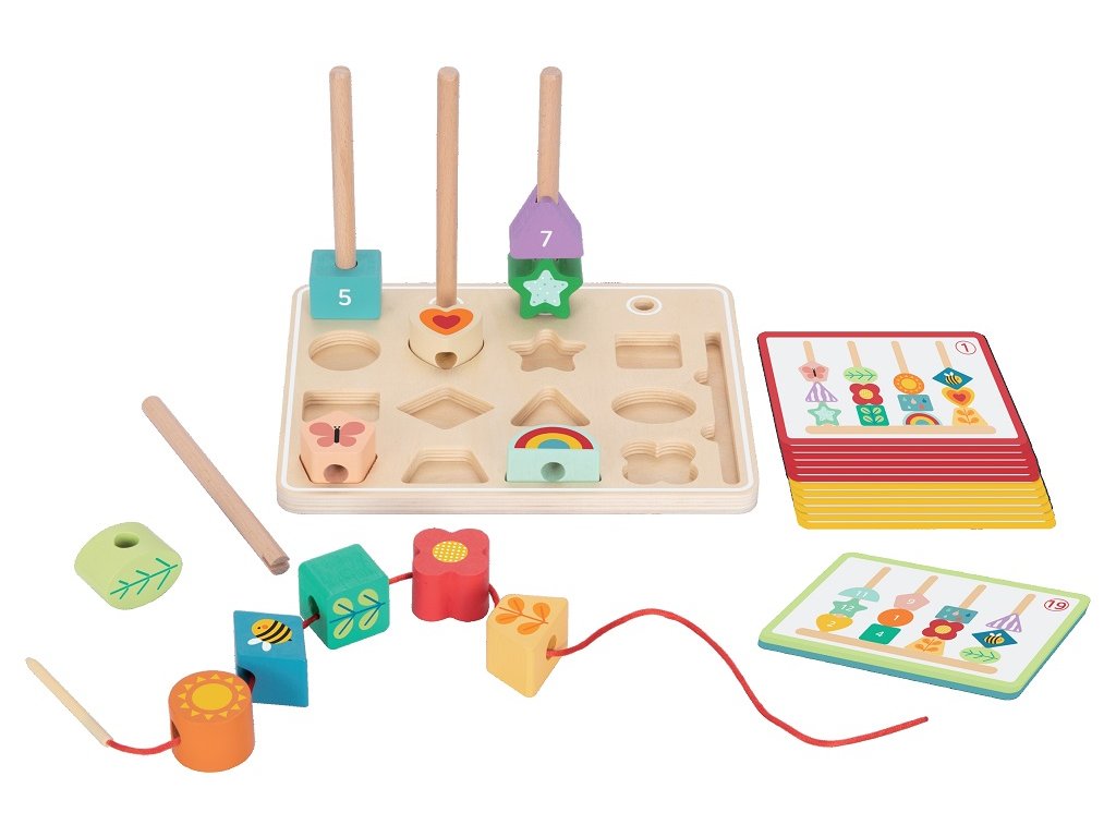 Dřevěná výuková hračka. Nasazování, vkládání i provlékaní barevných tvarů. Rozvíjí zručnost a představivost dětí. Vložíte tvar do správného otvoru? Kolik tvarů se Vám podaří provléknout? Nasadíte barevné tvary na tyč podle předem daného obrázku? Mnoho variant ke hraní! Hračka obsahuje několik druhů karet. Můžete tedy nasadit tvary na tyč dle vlastní fantazie nebo to zkusit přesně podle kartiček? Podle téhle Vám to nejde? Tak ji vyměňte za jinou! Hlavní vlastnosti: inspirováno Montessori hračkaminasazovačka, vkládačka a provlékačka v jednomrozvíjí jemnou motoriku, koordinaci ruka-okovhodné od 18 měsíců Značka a certifikát FSC® (Forest Stewardship Council) zaručuje, že dřevo, ze kterého byl produkt vyroben, nebylo vytěženo nelegálně a pochází z lesů obhospodařovaných šetrným či přírodě blízkým způsobem, ve kterém jsou dodržovány přísné environmentální a sociální požadavky. Značka FSC® na výrobku znamená, že svým nákupem pomáháte chránit lesy a podporujete šetrné, odpovědné či přírodě blízké hospodaření, díky kterému jsou naše lesy stabilnější, zdravější, mají přirozenou druhovou skladbu a lépe odolávají negativním následkům klimatických změn.