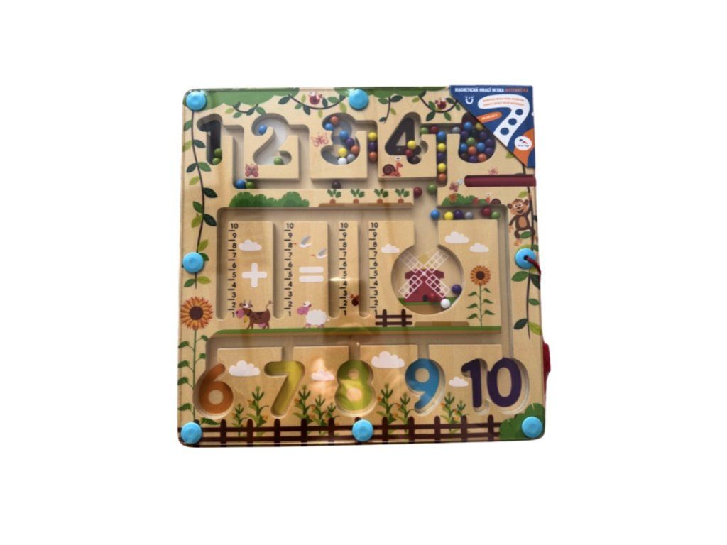 Vydejte se na cestu přírodou s barevnými kuličkami. Provedete úspěšně různobarevné kuličky všemi zákoutími? Umístíte všechny do mlýna? Vejdou se tam? Nebo pomocí čísel na metru vytvoříte a vypočítáte příklad? K vedení kuliček se při hře využívá magnetické ukazovátko, které prověří dětskou trpělivost a koordinaci rukou a zraku. Dokážete pak navrátit kuličky zpět na své místo podle barvy? Je počet kuliček stejný jako číslo, do kterého jste je umístili? Zábavná dřevěná hra, která pomáhá dětem rozvíjet jemnou motoriku, orientovat se v prostoru a rozšiřovat slovní zásobu pojmenováváním barev a předmětů ve městě. Děti se také učí počítání zábavnou formou. Dřevěná základna v designu přírody je kryta odolnou průhlednou plastovou deskou, hračka je díky tomu bezpečná. Hlavní vlastnosti: úvod do světa počtůrozvíjí motorické dovednosti dětí zábavné i bezpečné díky magnetickému principu