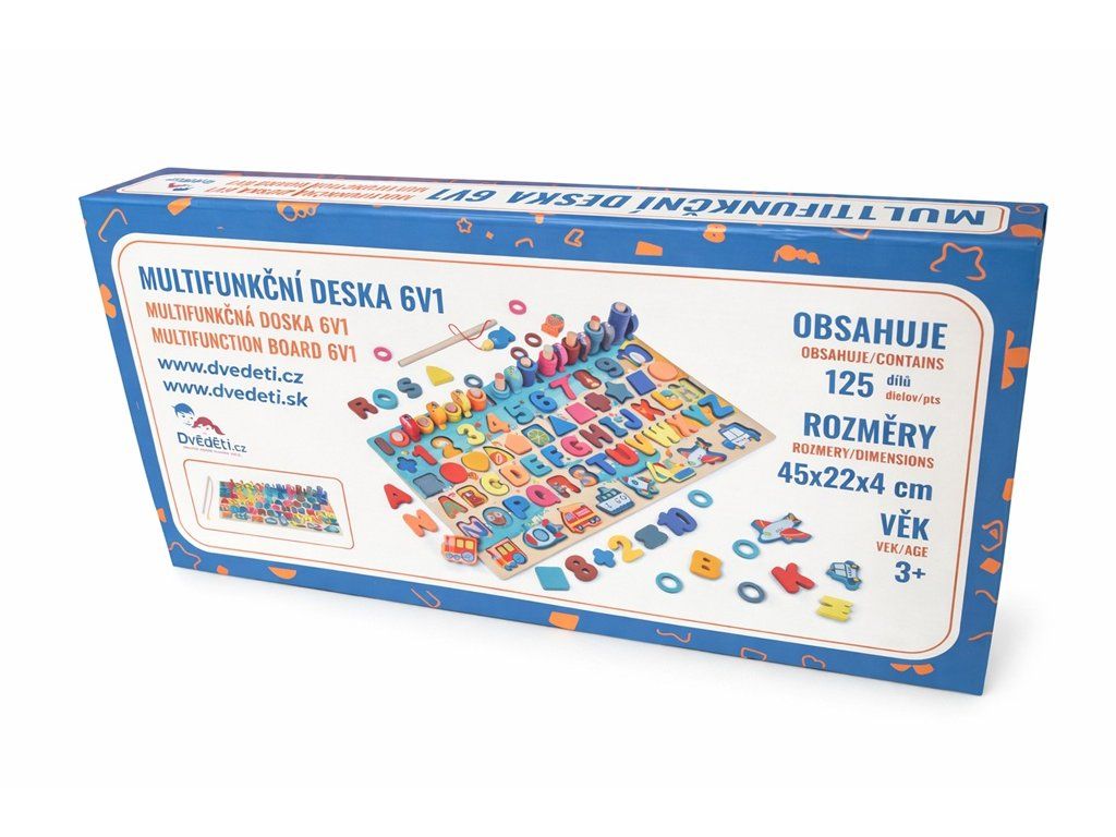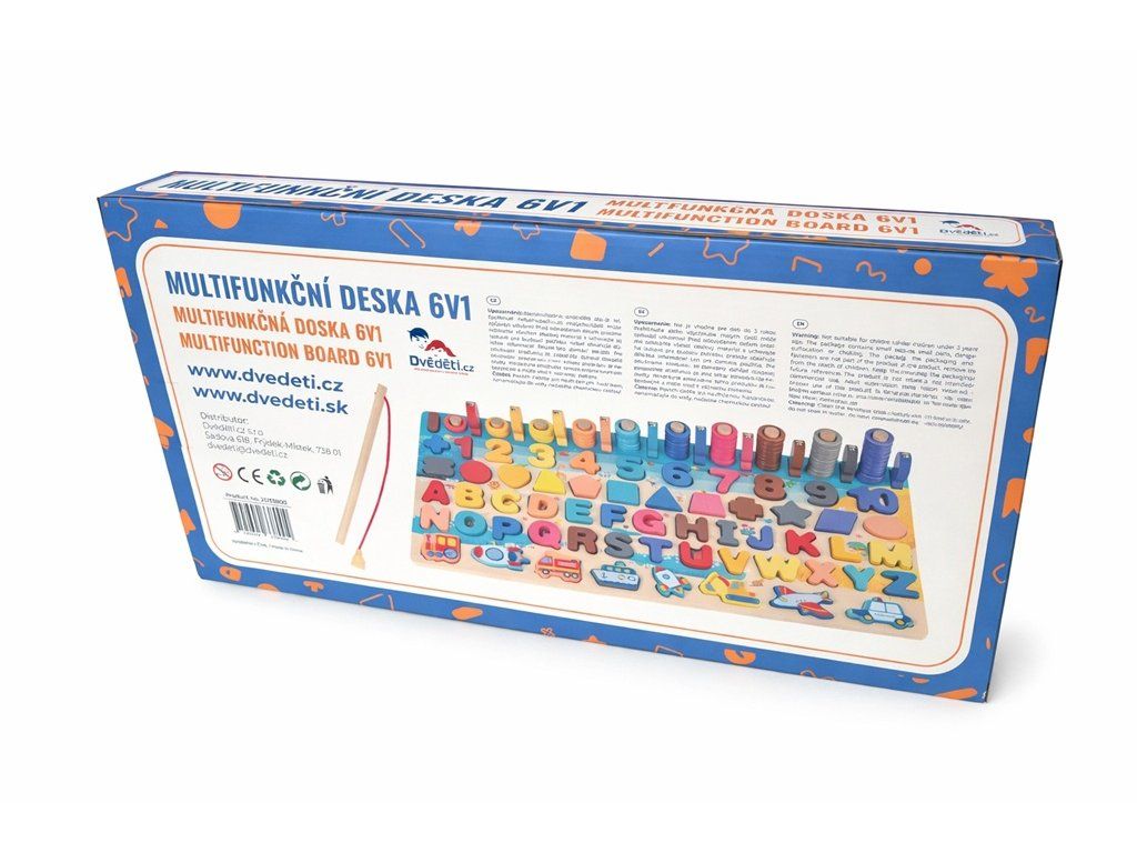 Každý malý šikula si najde to své! Dřevěná multifunkční deska nabízí edukativní hru a pomáhá dětem v koordinaci motoriky, zlepšování koncentrace a rozvoji logického myšlení. Jejím cílem je nejen učení přeměnit na zábavu, ale také vyvinout k učení u nejmenších kladný vztah. Vedle rozpoznávání čísel, tvarů a barev lze v této hře "rybařit" či stohovat kroužky na sebe. Všechny části dřevěné skládačky jsou dimenzovány tak, aby byly ideální pro drobné dětské ruce. Hlavní vlastnosti: multifunkční edukativní hraideální pro trénování motoriky a posílení logického myšlenípodporuje kreativitumění učení na zábavuveselý, pestrý design