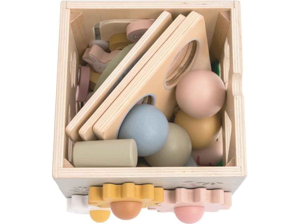 Objevujte svět a učte se zábavnou formou! Dřevěná motorická kostka s motivy farmy nabízí dětem pestrou škálu herních aktivit, které rozvíjejí jemnou motoriku, logické myšlení i koordinaci ruka-oko. Každá strana kostky přináší jinou zábavnou výzvu – od vkládání zvířátek, přes otáčení ozubenými kolečky, až po barevné vkládačky nebo jednoduché počítání. Hračka navíc obsahuje vyměnitelná víka s různými herními možnostmi. Děti mohou například přiřazovat obrázková kolečka ke správným předlohám a tím trénovat zrakové vnímání, třídění a soustředění. Nechybí ani oblíbená zatloukací hra, při které lze zatloukat dřevěné mrkvičky nebo kuličky. Během hry se děti učí rozpoznávat základní tvary, barvy i zvířátka. Veškeré díly lze uložit uvnitř kostky, takže po hraní zůstává vše pohromadě a nic se neztratí. Díky jemným pastelovým barvám a roztomilým ilustracím zvířátek je hračka nejen atraktivní a zábavná, ale je i pěkným doplňkem dětského pokojíčku či herny. Hlavní vlastnosti: 37 dílů5 herních stran plných aktivitvyměnitelná víka s různými hramivkládací puzzle se zvířátky a tvarydřevěná kladívková hra s mrkvičkamiozubená kolečka pro trénink jemné motorikyvše lze uložit dovnitř kostkyvhodné pro děti od 12 měsíců