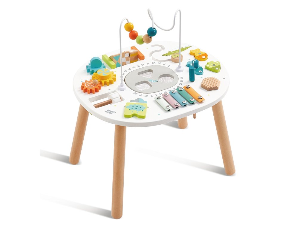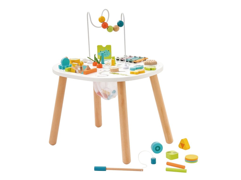 Tento multifunkční motorický stůl potěší nejen oko, ale také ostatní smysly. Perfektní hračka pro batolata, pomůže s rozvojem představivosti. Stoleček je plný multisenzorických aktivit, které zabaví všechny zvídavé děti. Najdou na něm korálkový labyrint, vkládačku, xylofon, ozubená kolečka, magnetické chytání rybiček a další! Takový počet aktivit děti zabaví na dlouhé hodiny. Tento robustní stoleček vám vydrží opravdu dlouho, je vyroben ze dřeva a dekorován jemnými barvami. Hlavní vlastnosti: vyrobeno ze dřevamultifunkční dřevěný aktivní stolekrozvíjí dětské smysly během hryveselý design stimuluje představivost