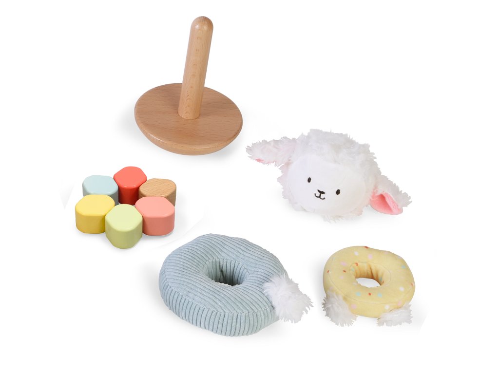 Ovečka zve děti ke hře plné barev, tvarů a objevování! Na dřevěnou tyčku, která tvoří tělo ovečky, se postupně nasazují kroužky o více velikostech z různých materiálů i textur. Nejdřív látkový kroužek s ocáskem a nakonec plyšová hlavička ovečky. Dokážete to nasadit správně, aby byla ovečka kompletní? Skládání rozvíjí jemnou motoriku, koordinaci ruka-oko i schopnost rozlišovat tvary, textury a velikosti. Hlavní vlastnosti: nasazování kroužků různých velikostí, materiálů i texturrozvíjí jemnou motoriku a koordinaci ruka-okopomáhá s rozpoznáváním tvarů a velikostí