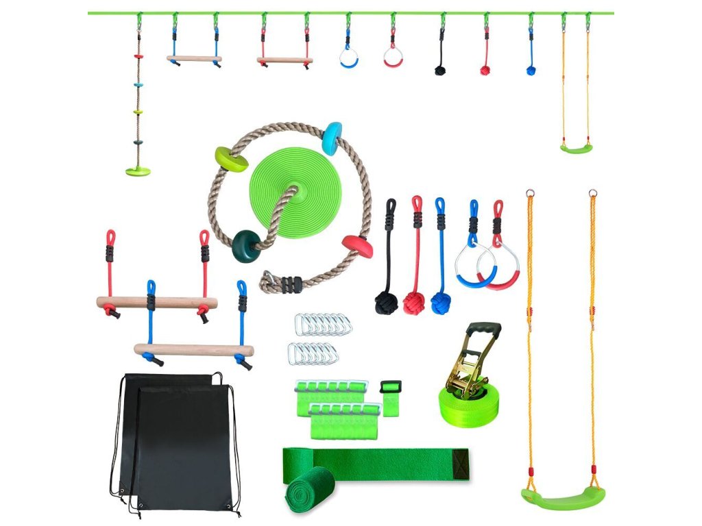 Buďte silní a obratní jako ninjové, překonejte jejich výcvikovou dráhu! Základem dráhy je odolný nylonový pás napnutý mezi dvěma stromy za pomoci robustní kovové račny. Na páse přitom může být pomocí karabin zavěšena řada různých překážek, které lze individuálně kombinovat, a dosáhnout tak různé obtížnosti. Lze jej ovšem využít i samostatně pro tzv. „slackline“. Díky praktické tašce z odolného umělého vlákna může být dráha snadno sbalena a připravena Vás doprovázet při všech toulkách a dobrodružstvích v přírodě. Obsah balení: 1 ks slackline1 ks upínací ráčna13 ks popruh se sponou13 ks trojúhelníková karabina2 ks chránič stromu1 ks houpačka2 ks gymnastický kruh3 ks úchop na pěst2 ks hrazda1 ks 5dílná houpačka lano2 ks úložná taška Hlavní vlastnosti: nosnost dráhy 150 kgvariabilní systém zavěšenípraktické balení