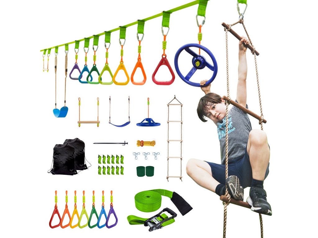 Buďte silní a obratní jako ninjové, překonejte jejich výcvikovou dráhu! Základem dráhy je odolný nylonový pás napnutý mezi dvěma stromy za pomoci robustní kovové račny. Na páse přitom může být pomocí karabin zavěšena řada různých překážek, které lze individuálně kombinovat, a dosáhnout tak různé obtížnosti. Lze jej ovšem využít i samostatně pro tzv. „slackline“. Díky praktické tašce z odolného umělého vlákna může být dráha snadno sbalena a připravena Vás doprovázet při všech toulkách a dobrodružstvích v přírodě. Obsah balení: 1 ks slackline1 ks upínací ráčna14 ks popruh se sponou14 ks trojúhelníková karabina2 ks chránič stromu1 ks houpačka7 ks gymnastický kruh1 ks plastový volant1 ks hrazda1 ks žebřík1 sada lepidlo2 ks úložná taška1 ks kolík (spolu s lanem slouží pro uchycení lezeckého žebříků k zemi)1 ks lano Hlavní vlastnosti: nosnost dráhy 150 kgvariabilní systém zavěšenípraktické balení