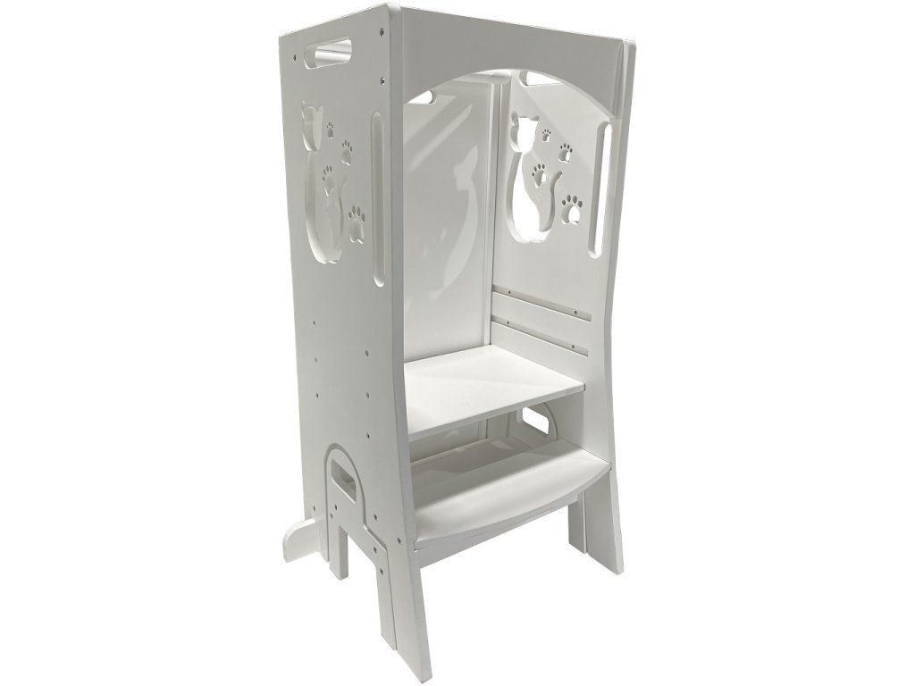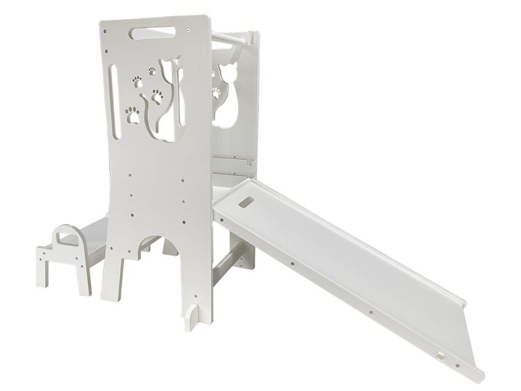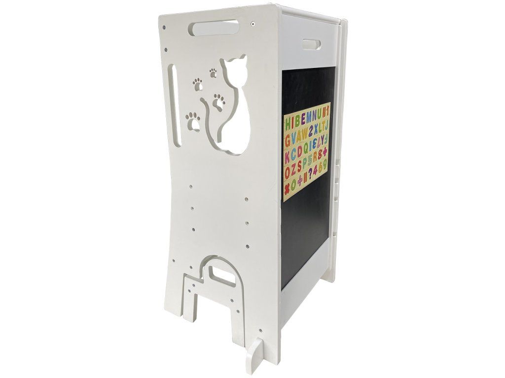Učící věže jsou víceúčelové stoličky, jenž dávají dětem možnost zapojit se do různých tvořivých činností u kuchyňské linky či pracovního stolu. Umožňuje nejmenším být v úrovni pracovní desky, vidět vše, co děláte a tvořit tak přímo s Vámi – díky tomu máte také neustálý dozor. Věž se skládá ze stojací plochy, na které dítě stojí, schůdku, po kterém se na ni dostane a z ohrádky okolo. Díky své multifunkčnosti si jde s věží i “hrát“. Obsahuje magnetickou tabulku s písmeny a číslicemi a v rozloženém stavu je doplněna o skluzavku. Při používání nenechávejte učící věž v prostoru, ale vždy věž umístěte stranou naproti schůdku k pevné překážce (kuchyňská linka apod.). Upozornění:Prodejem učící věže nepřebíráme odpovědnost za bezpečnost dítěte. Dítě na učící věži musí být pod stálým dozorem dospělé osoby! Hlavní vlastnosti: víceúčelový, funkční nábytekzdokonaluje motorické schopnostiodolná konstrukceobsahuje skluzavku a magnetickou tabulimoderní design s kočičkou