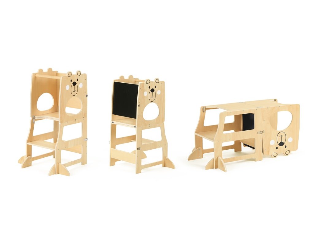Učící věže jsou víceúčelové stoličky, jenž dávají dětem možnost zapojit se do různých tvořivých činností u kuchyňské linky či pracovního stolu. Umožňuje nejmenším být v úrovni pracovní desky, vidět vše, co děláte a tvořit tak přímo s Vámi – díky tomu máte také neustálý dozor. Věž se skládá ze stojací plochy, na které dítě stojí, schůdku, po kterém se na ni dostane a z ohrádky okolo. Při používání nenechávejte učící věž v prostoru, ale vždy věž umístěte stranou naproti schůdku k pevné překážce (kuchyňská linka apod.). Upozornění:Prodejem učící věže nepřebíráme odpovědnost za bezpečnost dítěte. Dítě na učící věži musí být pod stálým dozorem dospělé osoby! Hlavní vlastnosti: víceúčelový, funkční nábytekzdokonaluje motorické schopnostiveselý design s medvídkem Značka a certifikát FSC® (Forest Stewardship Council) zaručuje, že dřevo, ze kterého byl produkt vyroben, nebylo vytěženo nelegálně a pochází z lesů obhospodařovaných šetrným či přírodě blízkým způsobem, ve kterém jsou dodržovány přísné environmentální a sociální požadavky. Značka FSC® na výrobku znamená, že svým nákupem pomáháte chránit lesy a podporujete šetrné, odpovědné či přírodě blízké hospodaření, díky kterému jsou naše lesy stabilnější, zdravější, mají přirozenou druhovou skladbu a lépe odolávají negativním následkům klimatických změn.