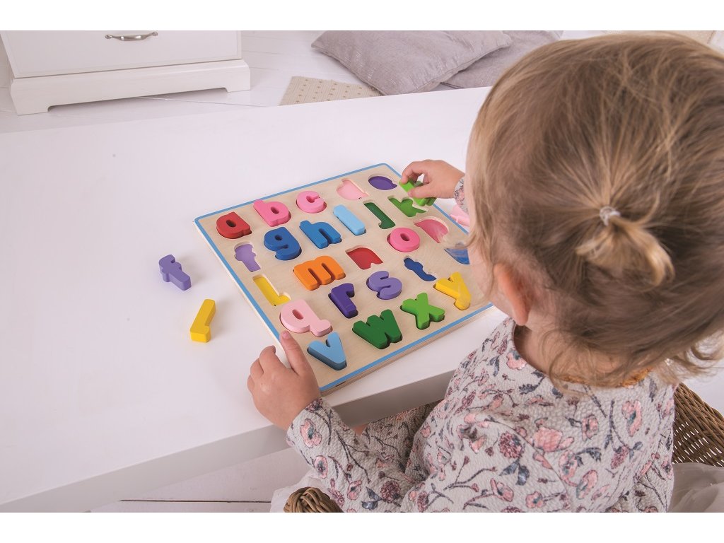 Pomocí této dřevěné pestrobarevné abecedy bude pro děti učení písmenek hračka. Každé písmenko je barevně sladěno se svým základním otvorem, což pomáhá rozvíjet schopnost vzpomínání a rozpoznávání. Dílky jsou robustní, akorát pro malou dětskou ručku. Pro toto vkládací puzzle je charakteristická šířka použitého materiálu, tím i bezpečnost hračky. Pro děti jednoduše uchopitelné. Hlavní vlastnosti: součástí balení je vše dle obrázkuobsahuje 26 dílkůvyrobeno z vysoce kvalitních materiálůvyhovuje současným evropským bezpečnostním normám