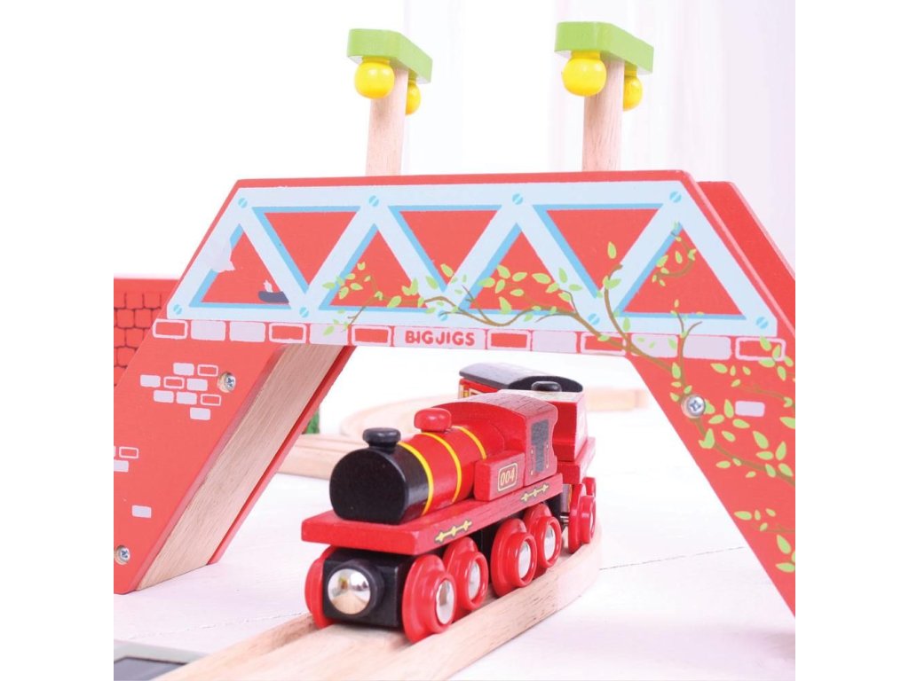 Bigjigs Rail Červená lokomotiva s tendrem + 3 koleje