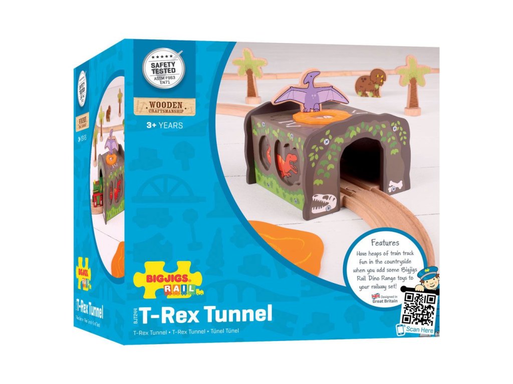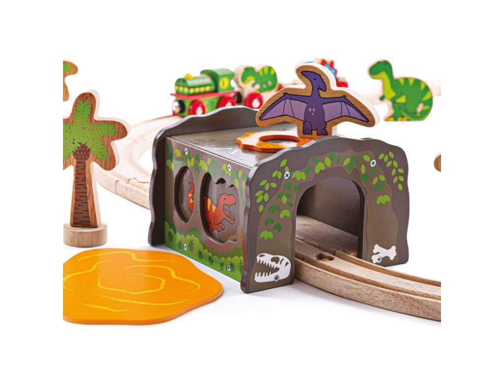 Fantasy dinosauří příslušenství vláčkodráhy, ve kterém se vzrušující svět železnice a prehistorické dinosauři doby spojili v jedno. Tunel přenáší děti do vzrušujícího světa fantazie, když se odváží projet svými vlaky děsivým tunelem a musí se vyhnout divokému T. rexovi a pterodactylovi strážící své hnízdo. Součástí balení je fialový pterodactyl. Hlavní vlastnosti: vláčkodráhy a jejich příslušenství značky Bigjigs Rail je možno kombinovat se všemi dalšími dřevěnými vláčkodráhami na trhu.vyrobeno z kvalitních a zodpovědně získaných přírodních materiálů.odpovídá současným evropským bezpečnostním normám.podporuje představivost, obratnost a koordinaci.