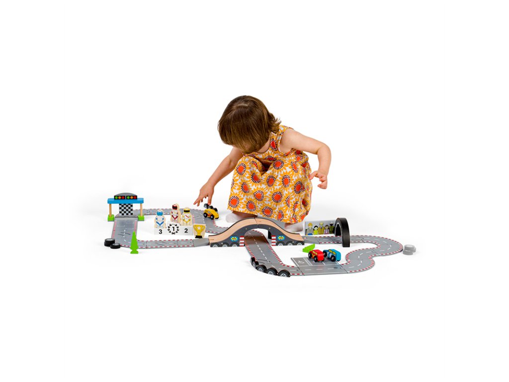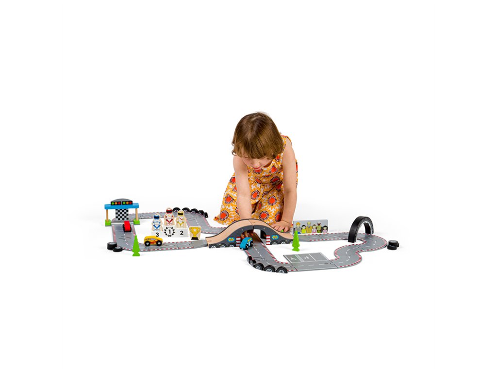Připravit! Pozor! Start! Tato fantastická dřevěná autodráha Závodní den je ideální dárek pro každého malého závodníka, nebo závodnici. Obsahuje řadu dřevěných silníčních dílů, 3 závodní auta, start/cíl a další příslušenství, což umožňuje dostatek prostoru pro zábavnou a kreativní hru. Lze ji použít s dalšími sadami Bigjigs Rail silnicemi a rozšířit tak rozmanitost herních aktivit. Lze kombinovat i se všemi ostatními dřevěnými silničními sadami na trhu. Rozvíjí koordinaci pohybů, jemnou motoriku, zručnost a představivost. Vyrobeno z vysoce kvalitních, zodpovědně získaných materiálů. Splňuje aktuální evropské bezpečnostní normy. Hlavní vlastnosti: 47 dílná dřevěná závodní dráhaobsahuje 3 závodní auta, 3 jezdce, pódium pro vítěze, hlavní tribunu, bariéry, semafory stromečky, pohár pro vítěze, nadjezd a díly závodní traťepodporuje představivost, obratnost a koordinacivhodné od 3 let