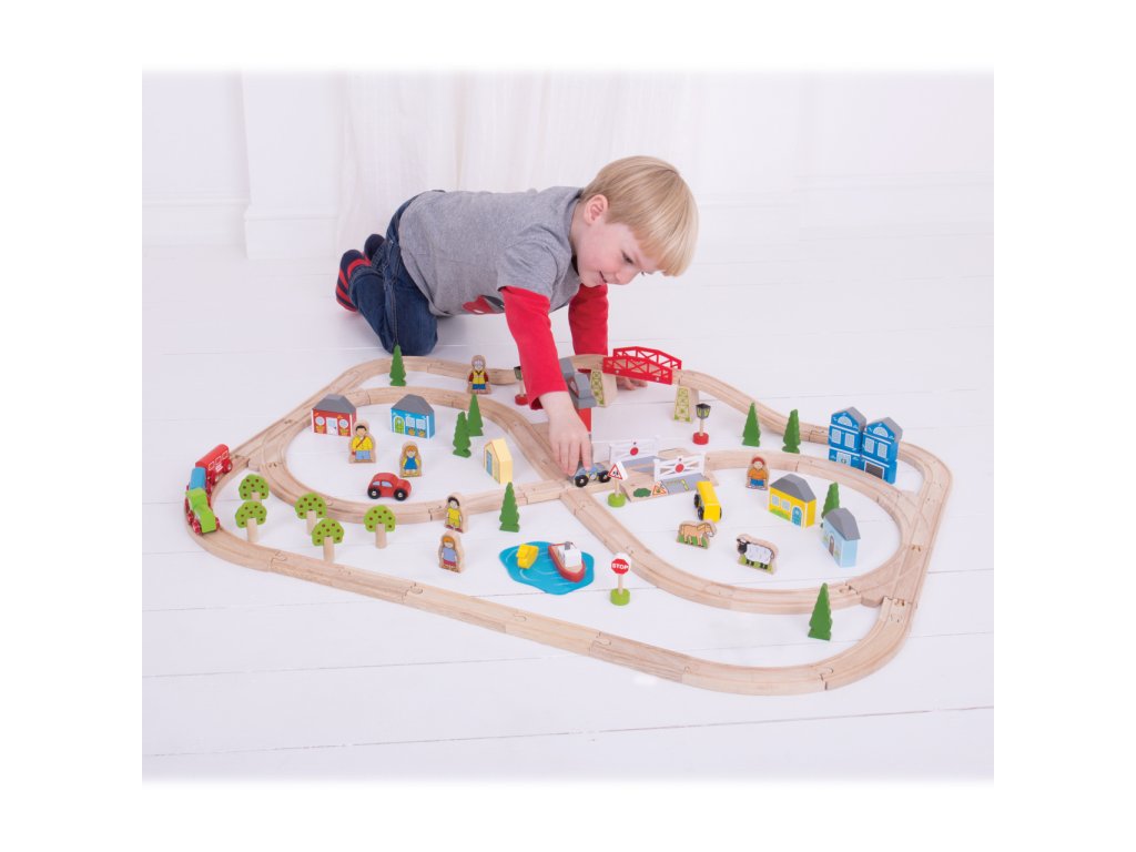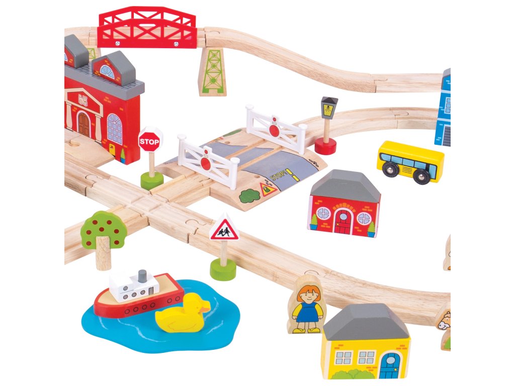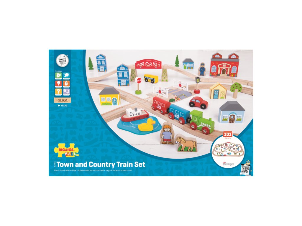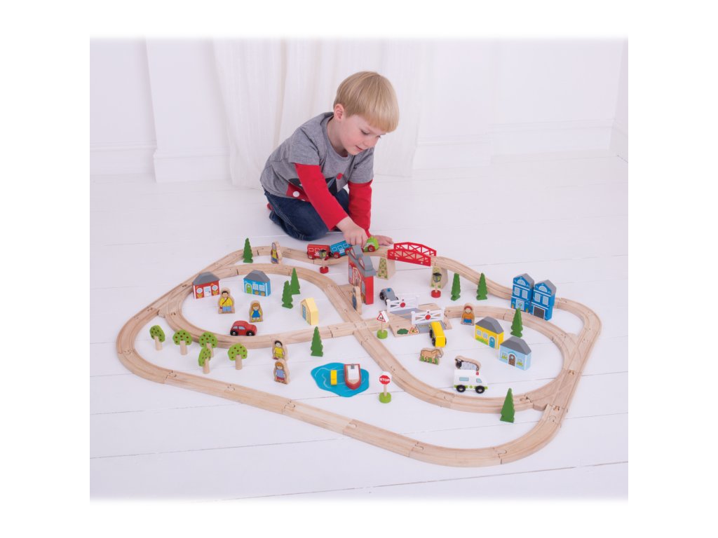 Sada obsahuje 91 kusů. Vláček jezdí přes město, přes most a ven do přírody, projíždí mezi stromy, domy a kolem kostela. Mezitím musí auta trpělivě čekat na vlakovém přejezdu, aby stihl vláček dorazit na nádraží přesně na čas.Hlavní vlastnosti: vláčkodráhy a jejich příslušenství značky Bigjigs Rail je možno kombinovat se všemi dalšími dřevěnými vláčkodráhami na trhuvyrobeno z kvalitních a zodpovědně získaných přírodních materiálůodpovídá současným evropským bezpečnostním normámpodporuje představivost, obratnost a koordinaci