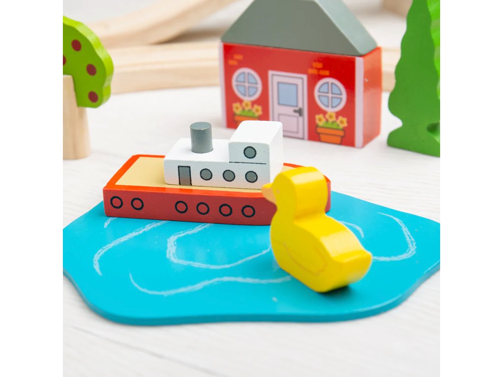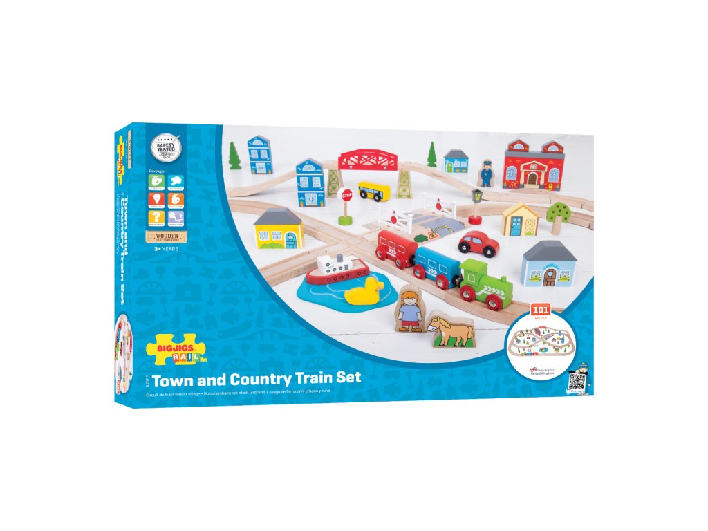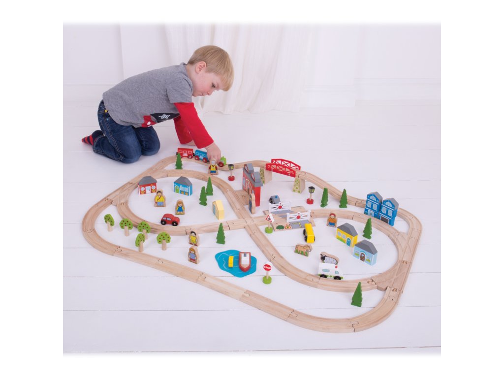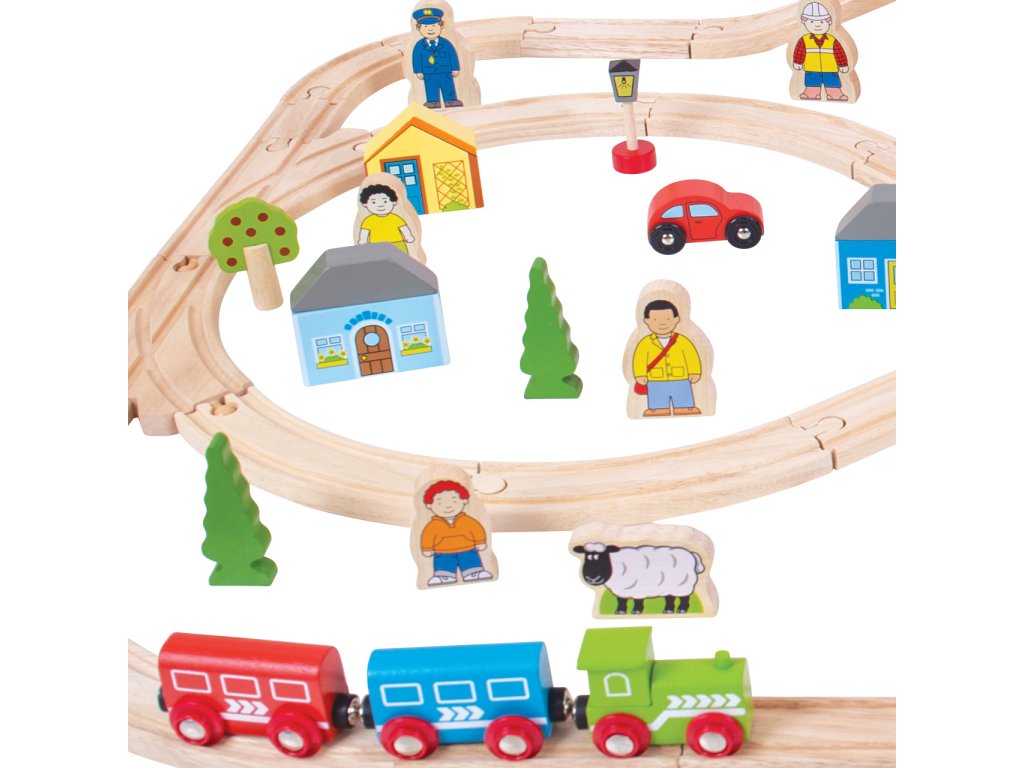 Sada obsahuje 91 kusů. Vláček jezdí přes město, přes most a ven do přírody, projíždí mezi stromy, domy a kolem kostela. Mezitím musí auta trpělivě čekat na vlakovém přejezdu, aby stihl vláček dorazit na nádraží přesně na čas.Hlavní vlastnosti: vláčkodráhy a jejich příslušenství značky Bigjigs Rail je možno kombinovat se všemi dalšími dřevěnými vláčkodráhami na trhuvyrobeno z kvalitních a zodpovědně získaných přírodních materiálůodpovídá současným evropským bezpečnostním normámpodporuje představivost, obratnost a koordinaci