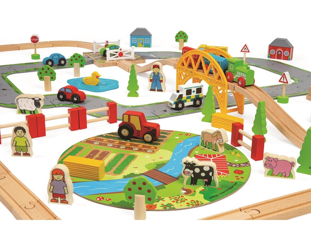 Tento hrací set je ideálním propojením dřevěné vláčkodráhy a autodráhy Bigjigs. Vláčkodráha přirozeně navazuje na cesty pomocí mostu a přejezdu jako v našem běžném dopravním světě. Okolí doplňuje a zkrášluje místní farma, budovy, stromy a autíčka.Hlavní vlastnosti: vláčkodráhy a jejich příslušenství značky Bigjigs Rail je možno kombinovat se všemi dalšími dřevěnými vláčkodráhami na trhuvyrobeno z kvalitních a zodpovědně získaných přírodních materiálůodpovídá současným evropským bezpečnostním normámpodporuje představivost, obratnost a koordinaci