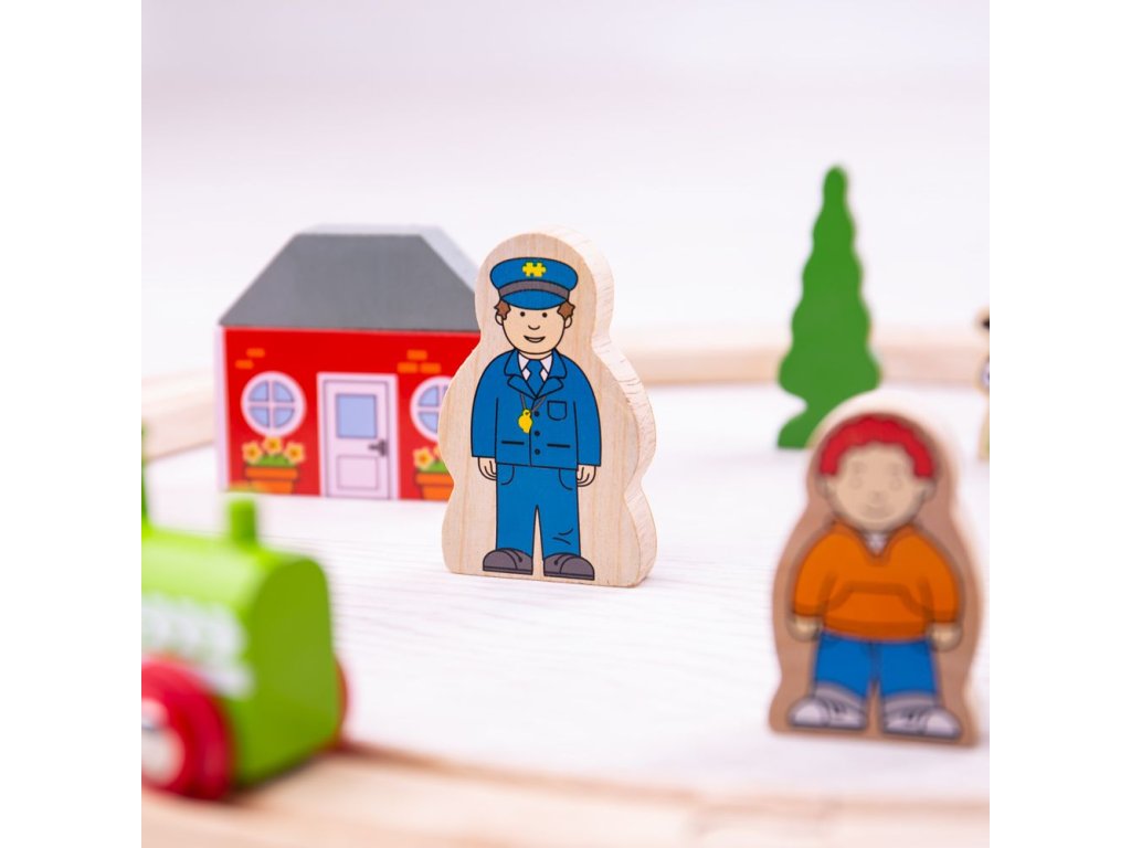 Zábavná 19 ks dřevěná vlaková souprava. Obsah balení: 8x kusů dřevěných kolejí1x lokomotiva2x vlakové vagónky s magnetickými spojkami8x doplňky: domy, stromy a postavy Hlavní vlastnosti: vláčkodráhy a jejich příslušenství značky Bigjigs Rail je možno kombinovat se všemi dalšími dřevěnými vláčkodráhami na trhuvyrobeno z kvalitních a zodpovědně získaných přírodních materiálůodpovídá současným evropským bezpečnostním normámpodporuje představivost, obratnost a koordinaci