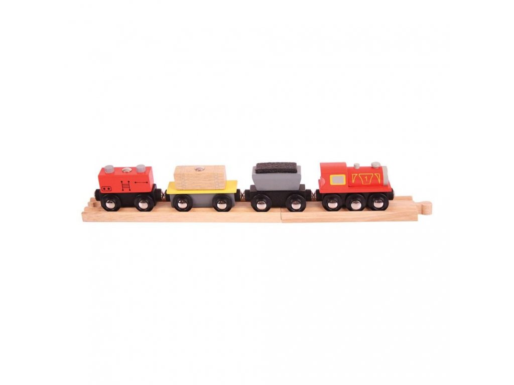 Součástí balení jsou také koleje: 2ks střední kolej BJT101 a 1ks koncová kolej BJT161!Tato jasně červená lokomotiva je dodávána se třemi nákladními vozy a dvěma kusy železnice. Ideální doplněk k jakémukoli dřevěnému setu vláčkodráh.Hlavní vlastnosti: Vláčkodráhy a jejich příslušenství značky Bigjigs Rail je možno kombinovat se všemi dalšími dřevěnými vláčkodráhami na trhu.Vyrobeno z kvalitních a zodpovědně získaných přírodních materiálů.Odpovídá současným evropským bezpečnostním normám.Podporuje představivost, obratnost a koordinaci.