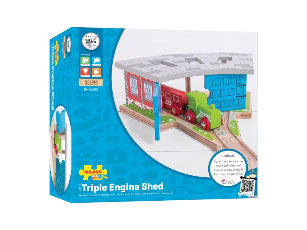 Trojité depo je skvělý způsob jak parkovat Vaše vláčky na konci dne. Chytré koleje v popředí umožňují vlakům vjet do třech různých směrů. Vláček není součástí balení. Hlavní vlastnosti: vláčkodráhy a jejich příslušenství značky Bigjigs Rail je možno kombinovat se všemi dalšími dřevěnými vláčkodráhami na trhuvyrobeno z kvalitních a zodpovědně získaných přírodních materiálůodpovídá současným evropským bezpečnostním normámpodporuje představivost, obratnost a koordinaci