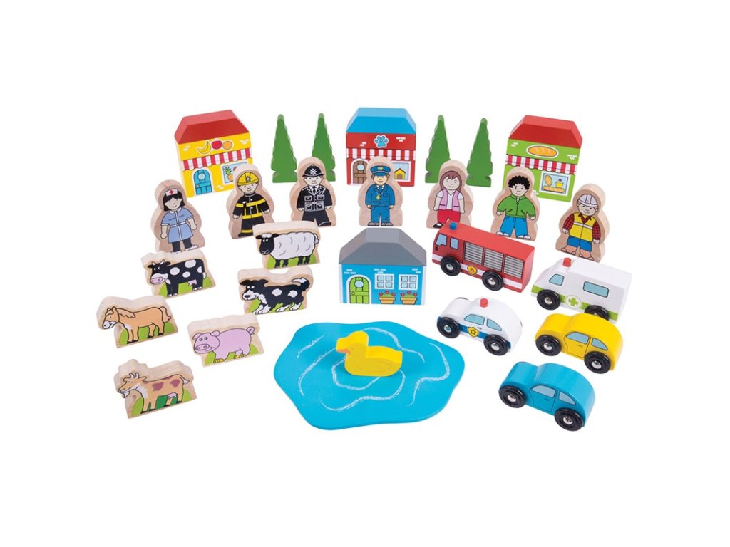 Pracovníci, nakupující, hospodářská zvířata, vozidla, domy a stromy jsou součástí velké sady, která zaujme děti po celé hodiny. Hlavní vlastnosti: vláčkodráhy a jejich příslušenství značky Bigjigs Rail je možno kombinovat se všemi dalšími dřevěnými vláčkodráhami na trhuvyrobeno z kvalitních a zodpovědně získaných přírodních materiálůodpovídá současným evropským bezpečnostním normámpodporuje představivost, obratnost a koordinaci