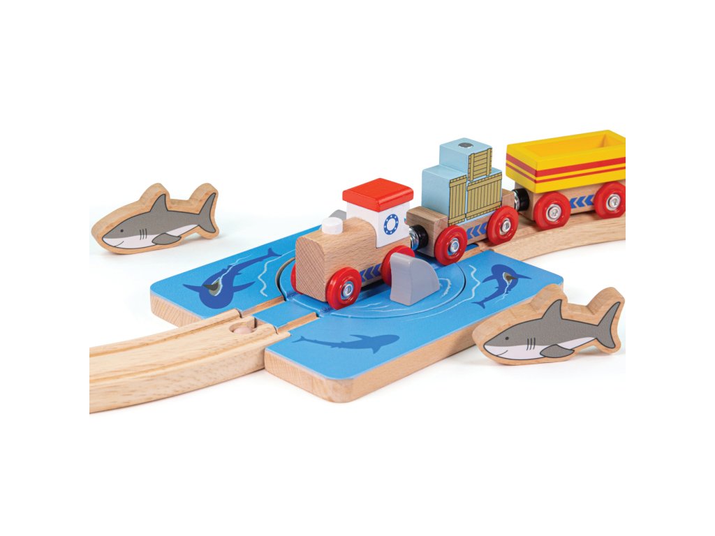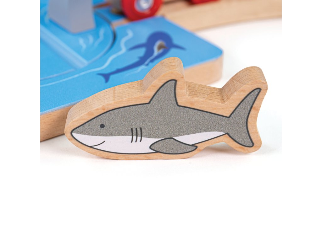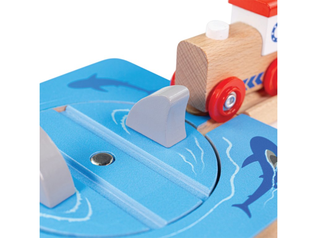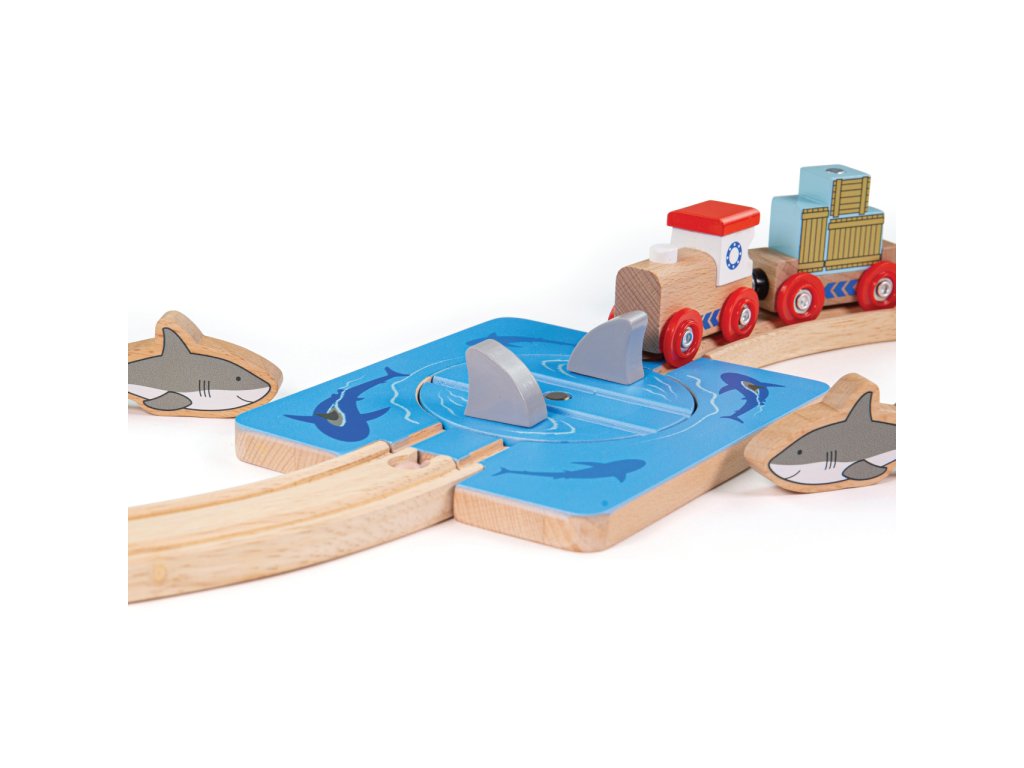 Pozor na žraločí čelisti! S tímto jednoduchým doplňkem vláčkodráhy budou moci Vaše děti prožívat fantastická dobrodružství. Základem je otočná platforma, jejímž otáčením lze střídavě zamezit, nebo umožnit průjezd vláčku. Manipulací mohou děti hravě rozvíjet zručnost i představivost. Součástí dílu dráhy je i dvojice robustních figurek žraloků, které hrám dodají na uvěřitelnosti. Rozšíření je zvláště vhodné k doplnění soupravy Úklid pobřeží. Vyrobeno z vysoce kvalitního, odpovědně získaného dřeva ošetřeného nezávadnými barvami a laky. Hlavní vlastnosti:otočná platforma a 2 figurkyrobustní, odolné a atraktivní zpracováníkompatibilní s vláčkodráhami dalších výrobců