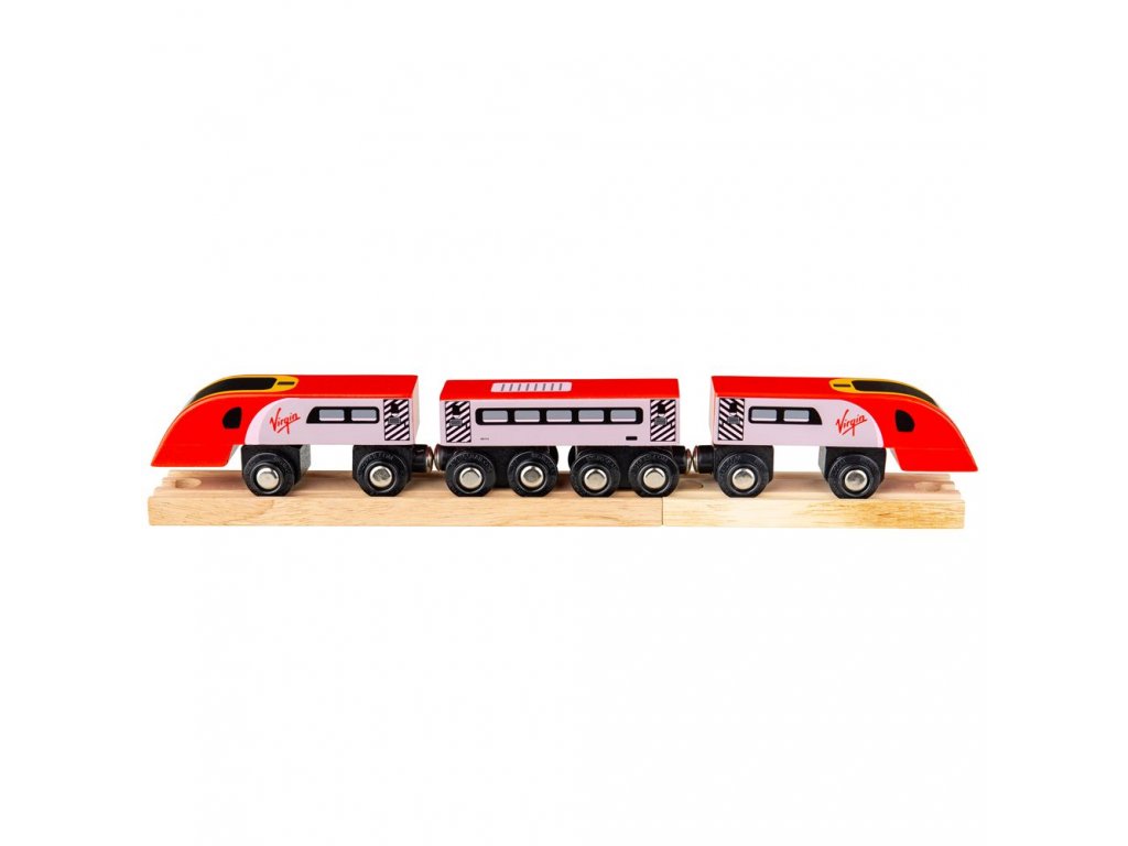 Cestujte stylově na Virgin Pendolinu. Tato dřevěná replika ikonického vlaku ve stylu Pendolino vám přináší spolupráci mezi Bigjigs Toys a Virgin Trains. Toto dřevěné Virgin Pendolino je dodáváno se dvěmi lokomotivami, vagónkem a 1kusem dlouhé koleje BJT100 a 1ks střední koleje BJT101. Hlavní vlastnosti: vláčkodráhy a jejich příslušenství značky Bigjigs Rail je možno kombinovat se všemi dalšími dřevěnými vláčkodráhami na trhuvyrobeno z kvalitních a zodpovědně získaných přírodních materiálůodpovídá současným evropským bezpečnostním normámpodporuje představivost, obratnost a koordinaci
