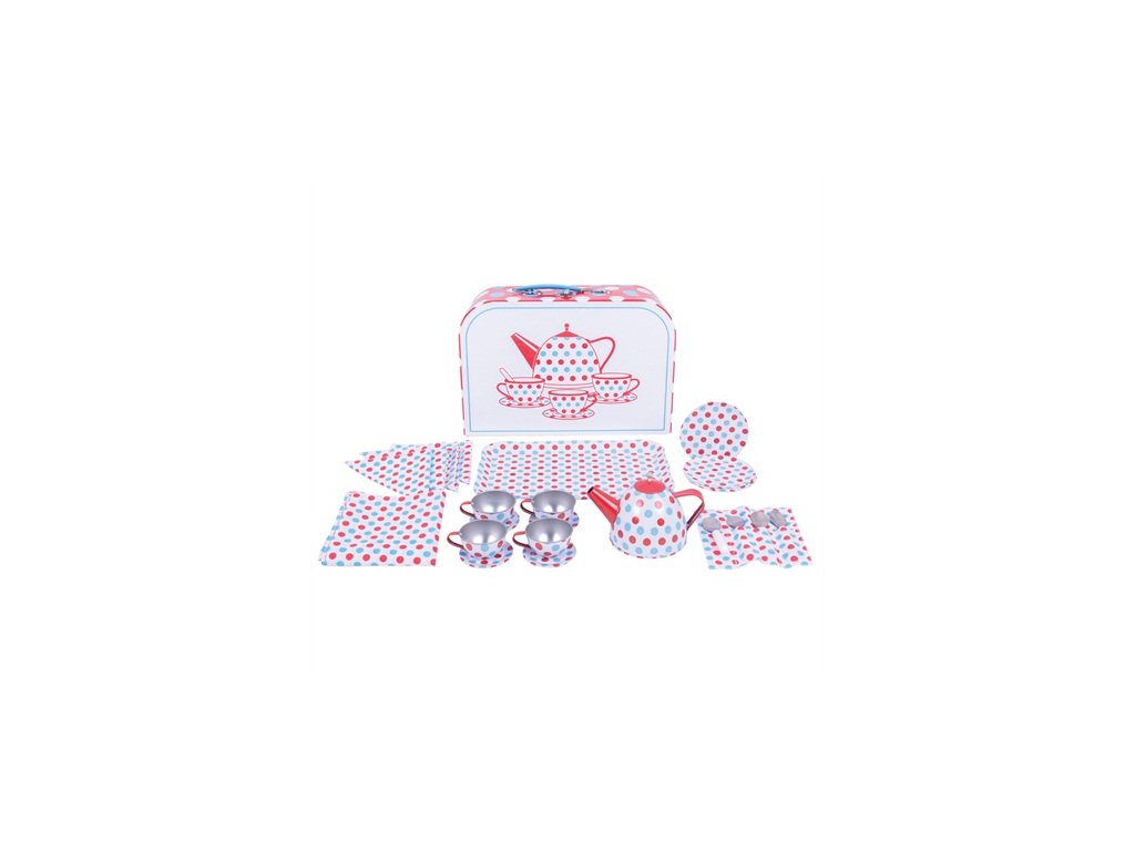 Tato nádherná puntíkovaná kovová čajová sada je pestře zbarvená a je dodávána s praktickým přenosným kufříkem! Obsahuje čtyři šálky a podšálky, čajovou konvici s odnímatelným víkem a tác. Také prostírání, sadu ginghamových ubrousků a čtyři lžičky ve vlastním ginghamovém obalu. Tato sada obsahuje vše, co vaše ratolest potřebuje k uspořádání dokonalého čajového večírku pro přátele nebo rodinu. Díky praktickému kufříku je také skvělým společníkem na cesty a znamená to, že váš malý hostitel může zajistit, že sada bude bezpečně uložena, když ji nepoužíváte. Skvělý způsob, jak podpořit kreativní a nápadité hraní. Hlavní vlastnosti: obsahuje čajovou konvici, šálky, podšálky, prostírání, lžičky a tácsplňuje aktuální evropské bezpečnostní normypodporuje kreativitu a nápaditostrozvíjí sociální dovednostizlepšuje obratnost a motoriku