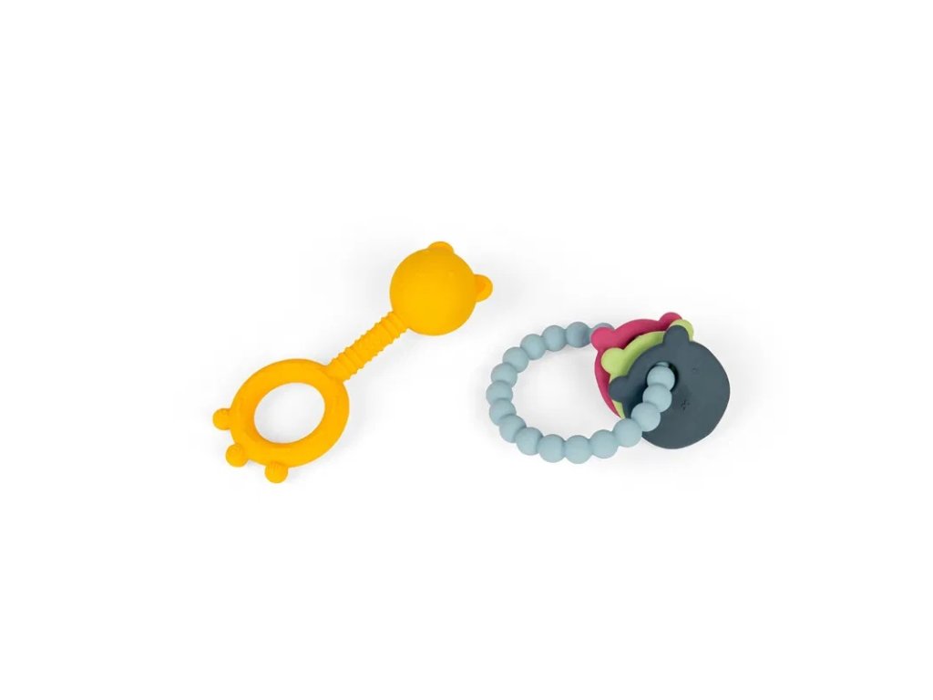 Sada vyrobená z potravinářského silikonu se skládá z chrastítka ve tvaru medvědí hlavy s kousátkem a kousacího kroužku s přívěsky speciálně navrženými pro uklidnění a zmírnění bolesti dásní při prořezávání zoubků. Hračky jsou odolné a lehké a svou velikostí vhodné pro malé dětské ručičky. Texturované povrchy a jemný chrastivý zvuk také poskytují smyslové podněty a zlepšují úchop a zručnost malých dětí. Sada je vyrobena z netoxického potravinářského silikonu, který se snadno udržuje a je bezpečný, a splňuje aktuální evropské bezpečnostní normy. Hlavní vlastnosti: chrastítko a kousátko 2 v 1 a kousací kroužek zmírňuje bolesti při prořezávání zoubkůvyrobeno z netoxického potravinářského silikonusnadná údržba, vhodné do myčky nádobívhodné od narození