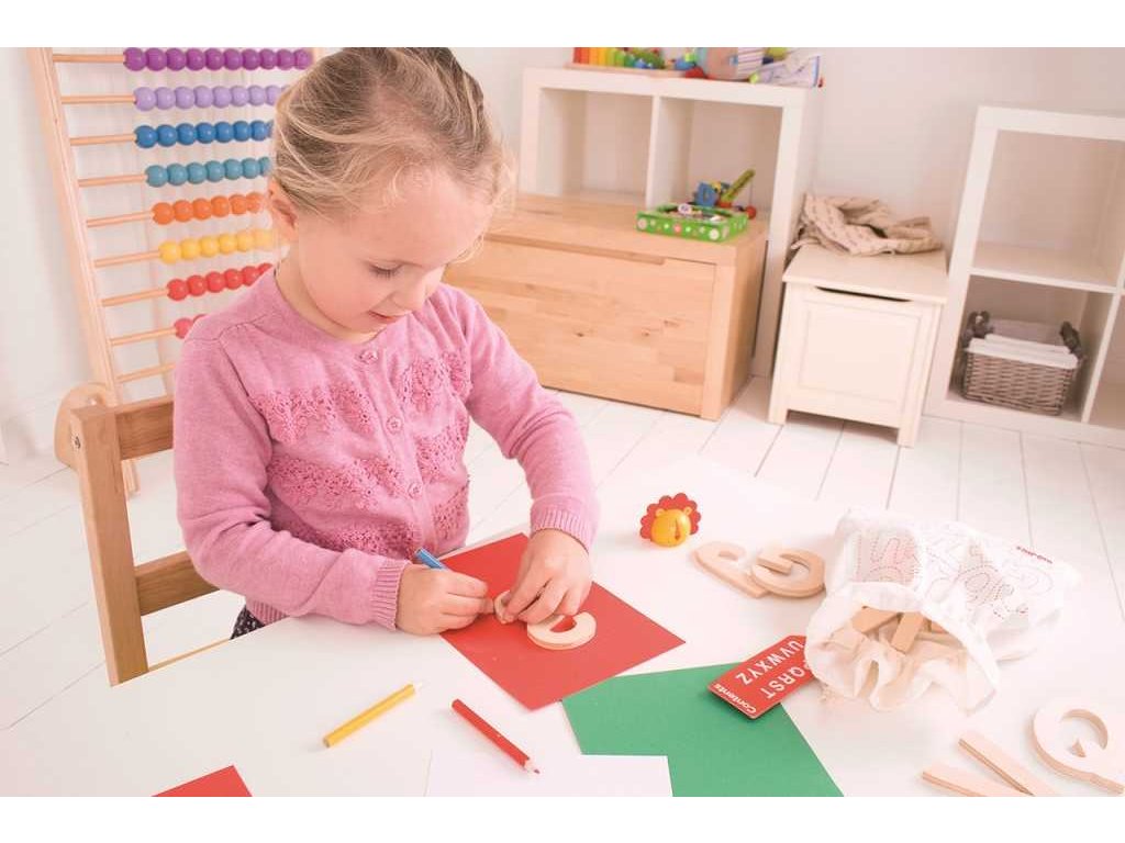 Šablony dřevěných písmen abecedy dětem pomohou s hláskováním, také si budou moci postavit vlastní slova nebo zanechat zprávy… Každé písmeno je vyrobeno z 4mm břízové překližky, vše zabaleno v textilním pytlíku na šňůrku. Škola hrou! Odpovídá evropským bezpečnostním standardům. V balení 26 dílků. Hlavní vlastnosti: břízová překližka26 dílků textilní pytlík