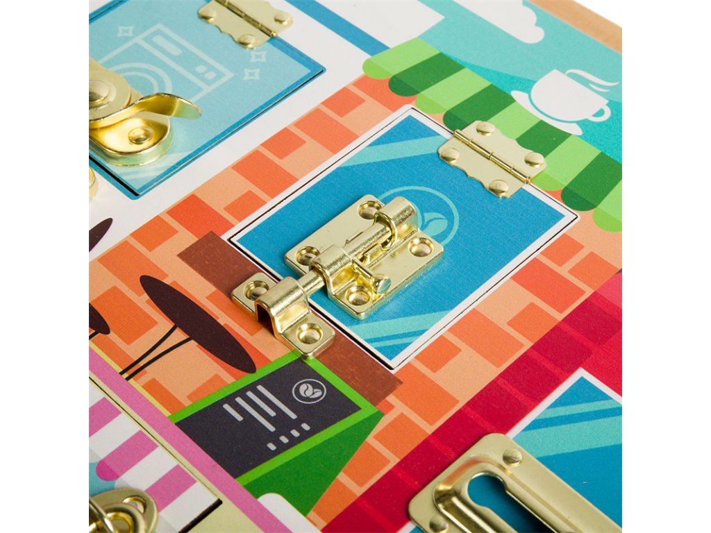 Zaměstnejte své ratolesti s naší motorickou deskou se zámky a západkami. Malé ručičky se mohou naučit používat různá zařízení, jako je překlápěcí západka, závora, panty, řetězový posuvný zámek, západka visacího zámku, otočná západka či západka s háčkem a okem. Za každým tímto montessori zámkem se připravte na odhalení prádelny, kuchyně, kavárny, útulného salonku a dalších. Montessori hračky pomáhají dětem rozvíjet jejich motorické dovednosti, koordinaci ruka-oko a zručnost. Deska je vyrobena z vysoce kvalitních, zodpovědně získaných materiálů. Hlavní vlastnosti: aktivity deska ve stylu Montessori se 6 různými zámkyrozvíjí motoriku, logiku a představivostvyrobeno z vysoce kvalitních materiálůvhodné od 2 let
