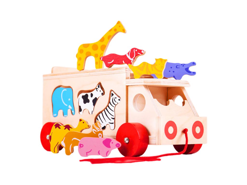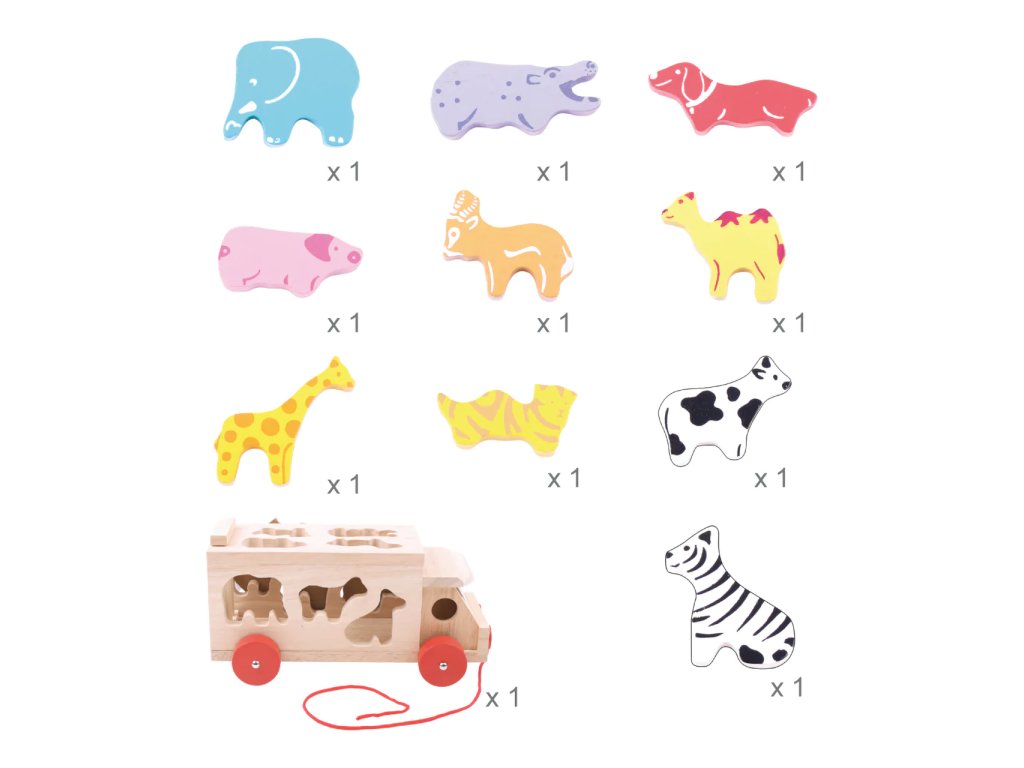 Roztřiďte tvary a naučte se vše o zvířatech. Vložte každé zvířátko do správného otvoru, zkontrolujte, zda jsou zadní dveře auta zavřené a táhnutím za šňůrku můžete vyjet. Tato pestrobarevná dřevěná zvířata lze naložit na nákladní vůz nebo je prostrčit pomocí speciálních otvorů. Hra pomáhá rozvíjet zručnost a koordinaci ruka-oko. Vyrobeno z vysoce kvalitních materiálů z odpovědných zdrojů. Vyhovuje současným evropským bezpečnostním normám. V balení 11 dílků. Hlavní vlastnosti: obsahuje 11 kusůrozvíjí zručnost a koordinaci