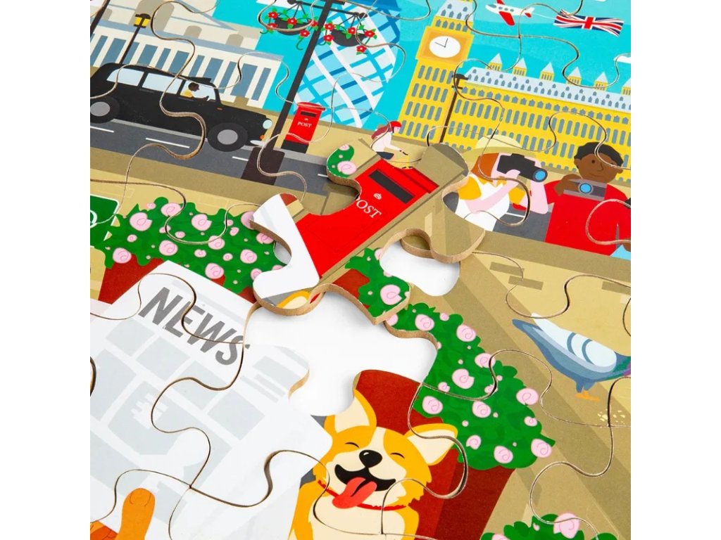 Prozkoumejte Londýn z pohodlí dětského pokoje a seznamte Vaše dítě s tím nejdůležitějším, co se v tomto ikonickém městě nachází, jako je Big Ben, Katedrála svatého Pavla, London Eye a další. Na obrázku je také typický londýnský černý taxík, červený autobus a telefonní budka. Skládání puzzle učí děti trpělivosti, vytrvalosti, týmové práci a řešení problémů a rozvíjí jemnou motoriku a koordinaci ruka-oko. Toto ekologické dřevěné puzzle je vyrobeno z prvotřídního a udržitelného dřeva s certifikací FSC® a nabarveno netoxickými barvami a laky. Splňuje aktuální evropské bezpečnostní normy. Hlavní vlastnosti: 48 dílkůvyrobeno ze dřeva s certifikací FSC®učí děti trpělivosti, vytrvalosti a týmové prácirozvíjí jemnou motoriku a koordinaci ruka-okovhodné od 2 let věku Značka a certifikát FSC® (Forest Stewardship Council) zaručuje, že dřevo, ze kterého byl produkt vyroben, nebylo vytěženo nelegálně a pochází z lesů obhospodařovaných šetrným či přírodě blízkým způsobem, ve kterém jsou dodržovány přísné environmentální a sociální požadavky. Značka FSC® na výrobku znamená, že svým nákupem pomáháte chránit lesy a podporujete šetrné, odpovědné či přírodě blízké hospodaření, díky kterému jsou naše lesy stabilnější, zdravější, mají přirozenou druhovou skladbu a lépe odolávají negativním následkům klimatických změn.