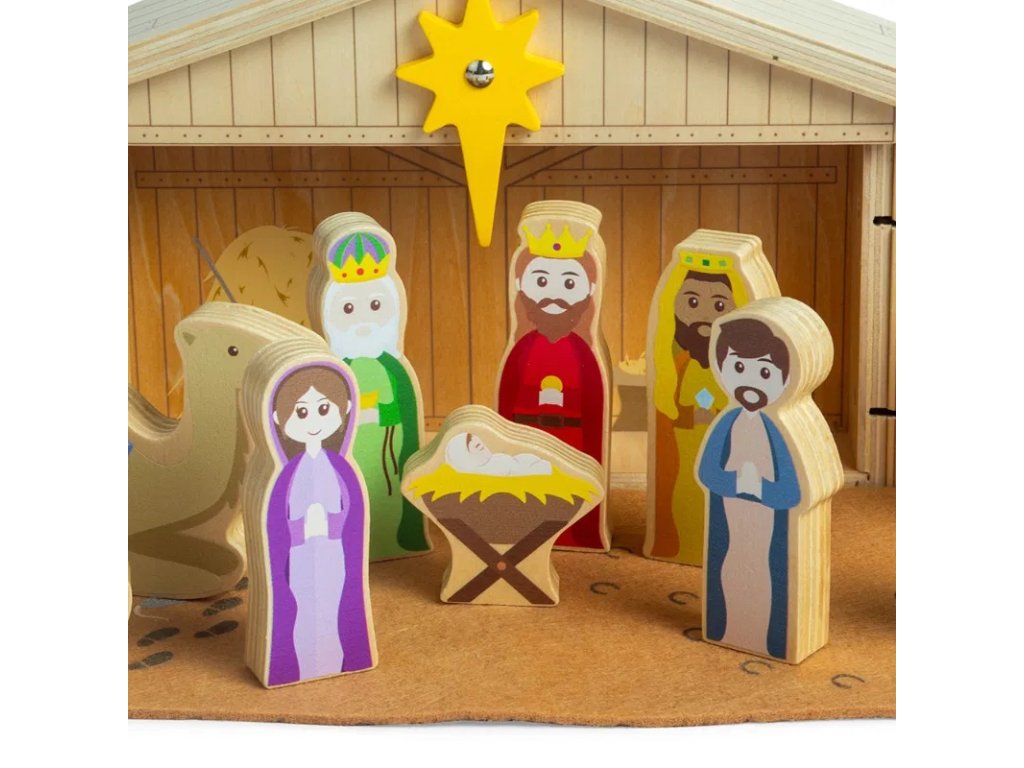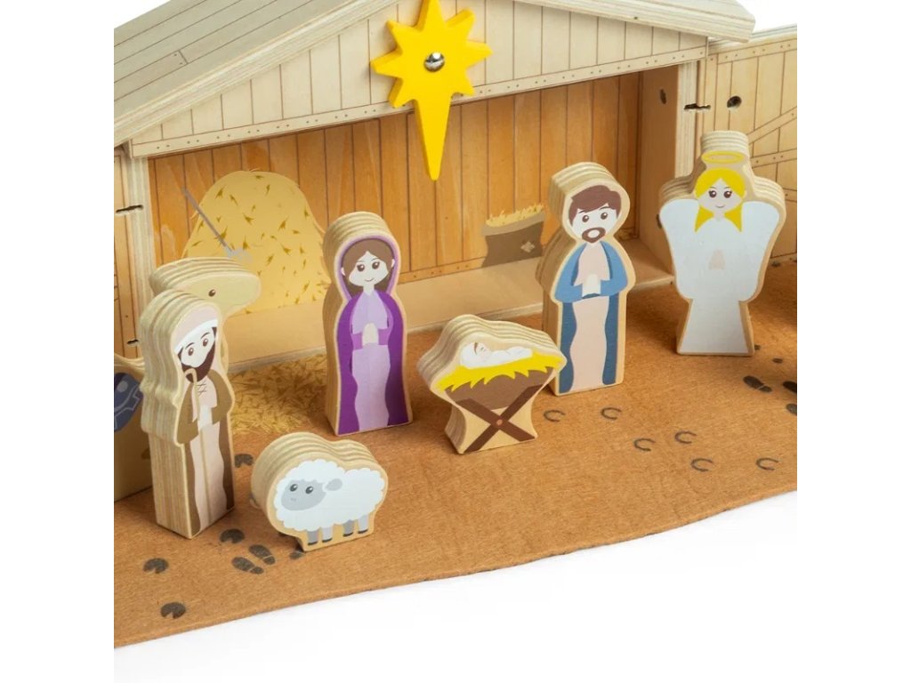 Připomeňte si tradiční vánoční příběh! Scéna Narození Páně zobrazuje novorozeného Ježíška v jesličkách v chlévě spolu s Josefem a pannou Marií. Nad Ježíškem svítí hvězda, která za ním do Betléma přivedla tři krále. Součástí jsou další figurky: pastýř, anděl a zvířátka. Tento betlém může být vzdělávací pomůckou, jak přiblížit příběh narození Ježíška dětem nebo jako dekorace do dětského pokojíčku či herny. Děti si mohou o narození Ježíška vyprávět nebo si vánoční příběh zahrát jako divadelní představení. Prostřednictvím hry rozvíjejí kreativitu, jazykové a sociální dovednosti. Betlém je vyroben udržitelným způsobem z prvotřídního dřeva s certifikací FSC® a opatřen netoxickými barvami a laky. Splňuje aktuální evropské bezpečnostní normy. Hlavní vlastnosti: 13 dílůvyrobeno ze dřeva s certifikací FSC®zahrnuje všechny důležité postavy příběhupodněcuje ke hře a vyprávění příběhůod 2 let věku Značka a certifikát FSC® (Forest Stewardship Council) zaručuje, že dřevo, ze kterého byl produkt vyroben, nebylo vytěženo nelegálně a pochází z lesů obhospodařovaných šetrným či přírodě blízkým způsobem, ve kterém jsou dodržovány přísné environmentální a sociální požadavky. Značka FSC® na výrobku znamená, že svým nákupem pomáháte chránit lesy a podporujete šetrné, odpovědné či přírodě blízké hospodaření, díky kterému jsou naše lesy stabilnější, zdravější, mají přirozenou druhovou skladbu a lépe odolávají negativním následkům klimatických změn.