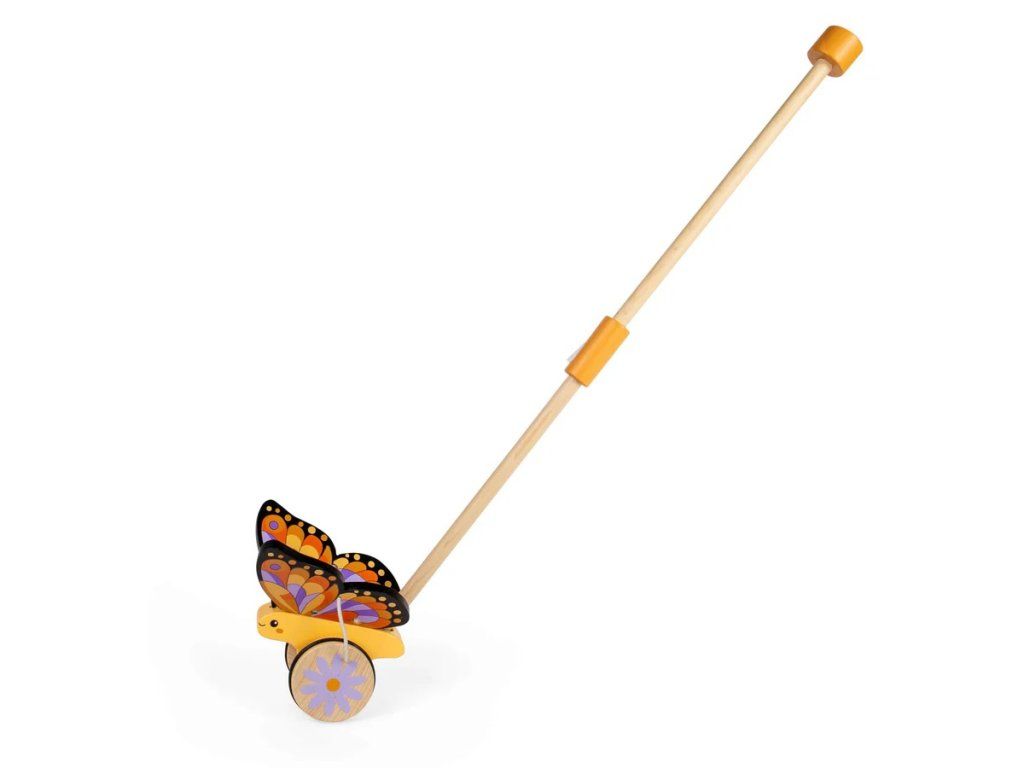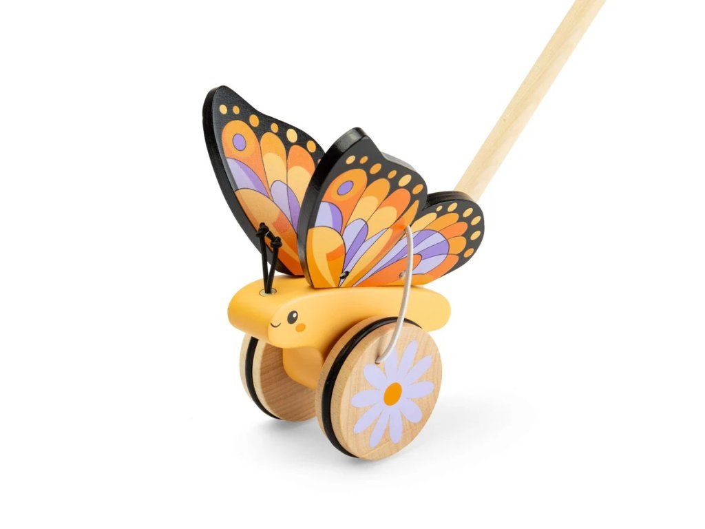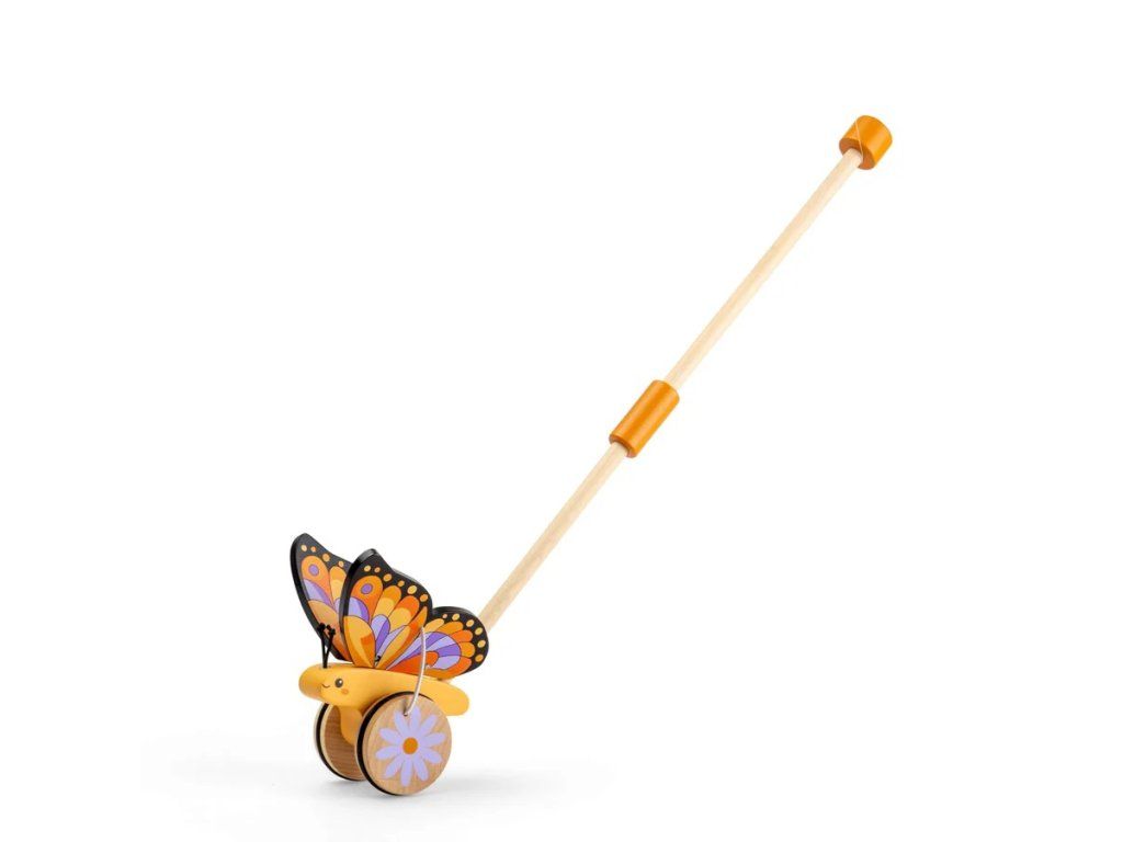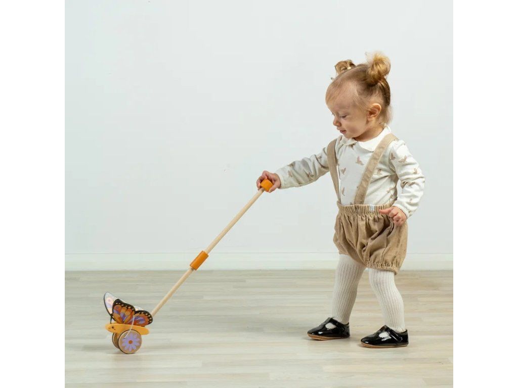 Podpořte první krůčky vašeho dítěte s touto krásnou motýlí hračkou na tlačení. Je navržena pro malé ručičky a pomáhá dětem objevovat pohyb zábavnou a hravou formou. Motýl zaujme barevným designem a veselými detaily. Při tlačení se jeho křídla třepotají, což děti motivuje k dalšímu pohybu. Velká kola s jemným květinovým motivem zajišťují stabilitu a plynulý pohyb. Praktická skládací rukojeť se dá snadno rozložit, což usnadňuje skladování i přenášení. Hračka podporuje rozvoj rovnováhy, koordinace a celkové mobility. Zároveň pomáhá dětem pochopit vztah mezi pohybem a reakcí. Motýlek je vyroben z kvalitního FSC® certifikovaného dřeva z udržitelných zdrojů a dodáván v ekologickém balení bez plastů. Hlavní vlastnosti: dřevěná hračka na tlačení se skládací rukojetí třepotající se křídla pro zábavný pohyb podporuje rozvoj rovnováhy, koordinace a motoriky vyrobeno z FSC® certifikovaného dřeva ekologické balení bez plastů vhodné pro děti od 12 měsíců Značka a certifikát FSC® (Forest Stewardship Council) zaručuje, že dřevo, ze kterého byl produkt vyroben, nebylo vytěženo nelegálně a pochází z lesů obhospodařovaných šetrným či přírodě blízkým způsobem, ve kterém jsou dodržovány přísné environmentální a sociální požadavky. Značka FSC® na výrobku znamená, že svým nákupem pomáháte chránit lesy a podporujete šetrné, odpovědné či přírodě blízké hospodaření, díky kterému jsou naše lesy stabilnější, zdravější, mají přirozenou druhovou skladbu a lépe odolávají negativním následkům klimatických změn.