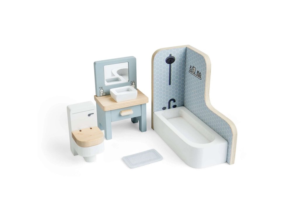 Žádný domeček pro panenky není kompletní bez koupelny! Dopřejte panenkám relaxační koupel nebo je připravte na nový den s touto elegantní dřevěnou koupelnovou sadou. Moderně laděná sada obsahuje vše, co malá domácnost potřebuje – vanu se sprchou, toaletu i umyvadlo se zrcadlem. Jemné barevné provedení a kvalitní dřevěné zpracování dodávají koupelně realistický vzhled a umožňují dětem vytvářet vlastní příběhy z každodenního života. Při hře si děti přirozeně rozvíjejí fantazii, vyjadřování i sociální dovednosti a učí se napodobovat běžné hygienické návyky. Nábytek je vyroben z prvotřídního, odpovědně získaného dřeva s certifikací FSC®, takže je bezpečný, odolný a šetrný k životnímu prostředí. Sadu lze snadno kombinovat s dalším nábytkem do domečku pro panenky a vytvořit tak harmonický domov podle dětských představ. Hlavní vlastnosti: koupelnová sada do domečku pro panenkyobsahuje 4 kusy nábytku: vanu se sprchou, toaletu, umyvadlo se zrcadlem, koupelnovou předložkupodporuje nápadité hraní, vyprávění příběhů a rozvoj sociálních dovednostípomáhá dětem napodobovat každodenní rutiny a budovat samostatnostvyrobeno z kvalitního dřeva s certifikací FSC®odolné provedení vhodné pro každodenní hraníkompatibilní s většinou standardních domečků pro panenkyvhodné pro děti od 3 let Značka a certifikát FSC® (Forest Stewardship Council) zaručuje, že dřevo, ze kterého byl produkt vyroben, nebylo vytěženo nelegálně a pochází z lesů obhospodařovaných šetrným či přírodě blízkým způsobem, ve kterém jsou dodržovány přísné environmentální a sociální požadavky. Značka FSC® na výrobku znamená, že svým nákupem pomáháte chránit lesy a podporujete šetrné, odpovědné či přírodě blízké hospodaření, díky kterému jsou naše lesy stabilnější, zdravější, mají přirozenou druhovou skladbu a lépe odolávají negativním následkům klimatických změn.