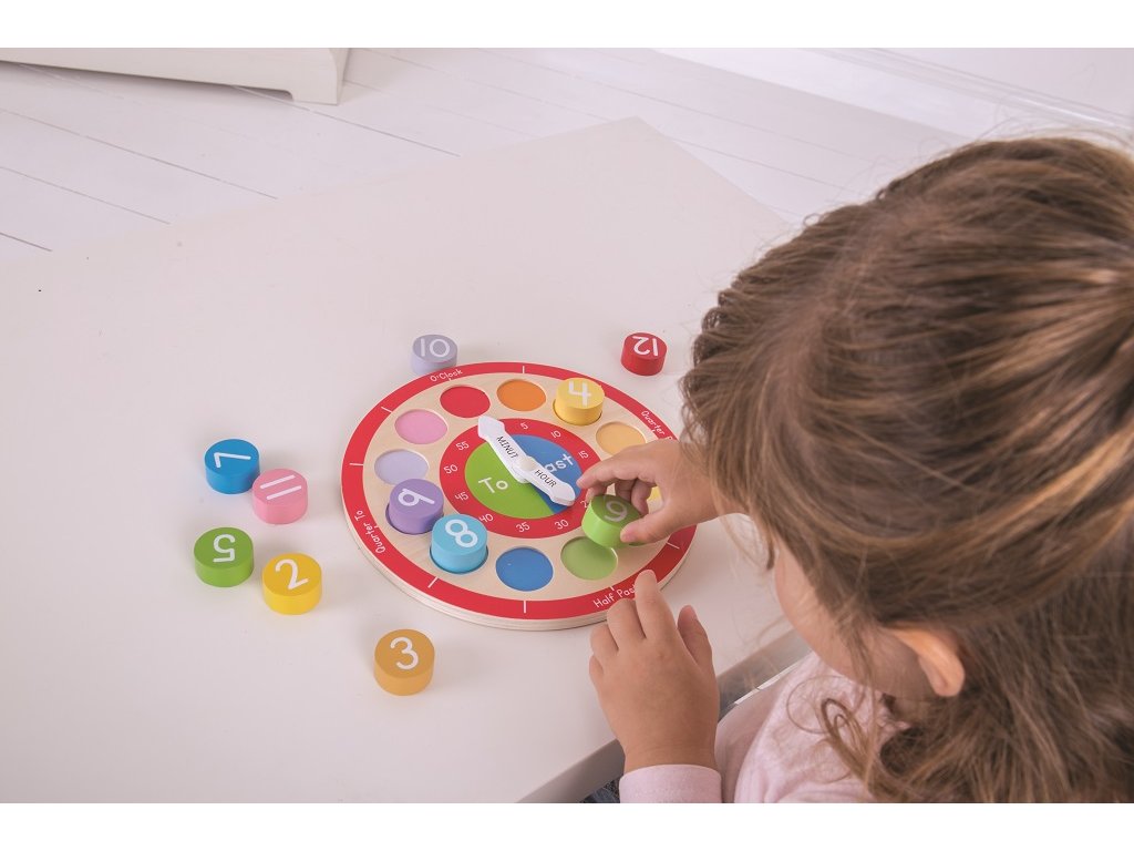 Jednoduchá hračka s tolika příležitostmi k učení – edukativní hodiny od Bigjigs Toys vytvářejí zábavný způsob, jak se učit o číslech, tvarech, barvách a poznávání času. Hodiny obsahují 12 kulatých odnímatelných dílků s čísly 1 až 12. Každý dílek je barevně sladěn se základním slotem, aby se rozvíjely schopnosti rozpoznávání. K dispozici je rozdělení na minuty a části hodiny, které děti naučí rozlišovat čas. Pochopí i rozdělení „čtvrt na“, „tři čtvrtě na“, „půl na“ a další! Pomáhá rozvíjet zručnost, smyslové dovednosti a koncentraci. Vyrobeno z vysoce kvalitních, zodpovědně získaných materiálů. Splňuje aktuální evropské bezpečnostní normy. Hlavní vlastnosti: obsahuje 12 odnímatelných dílů s číslyzákladní deska s popisy v angličtinězábavné učení se o číslech, tvarech, barvách a poznávání času