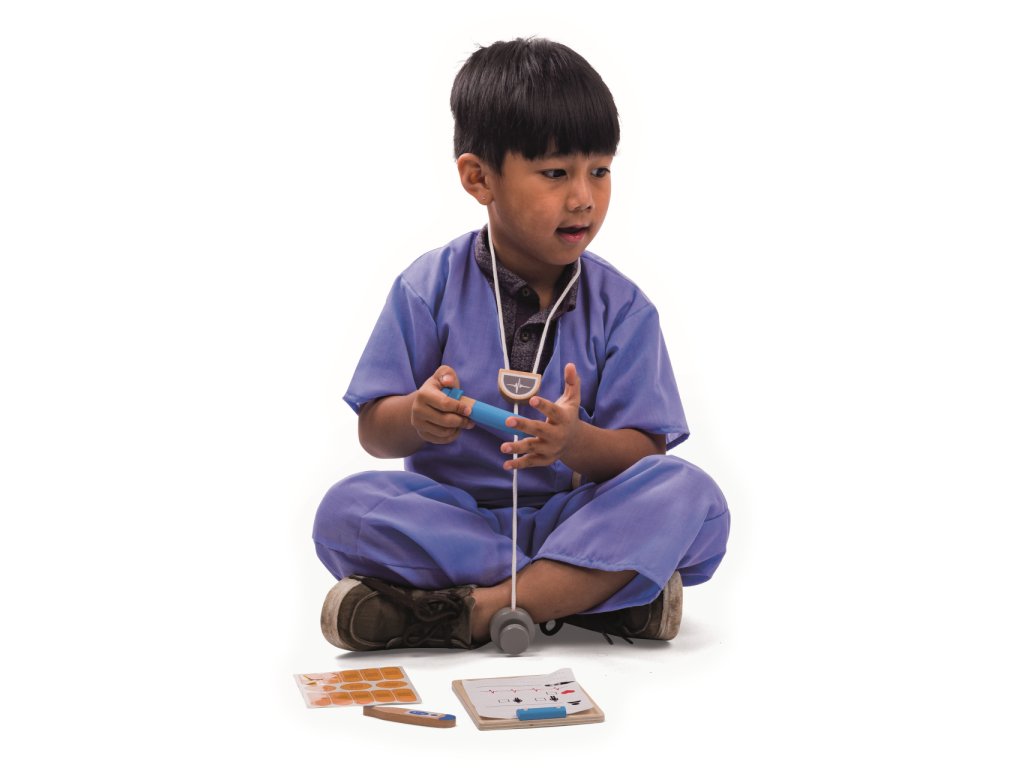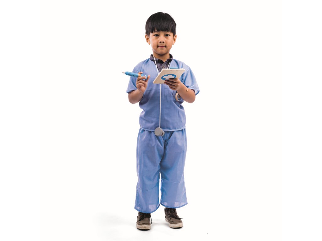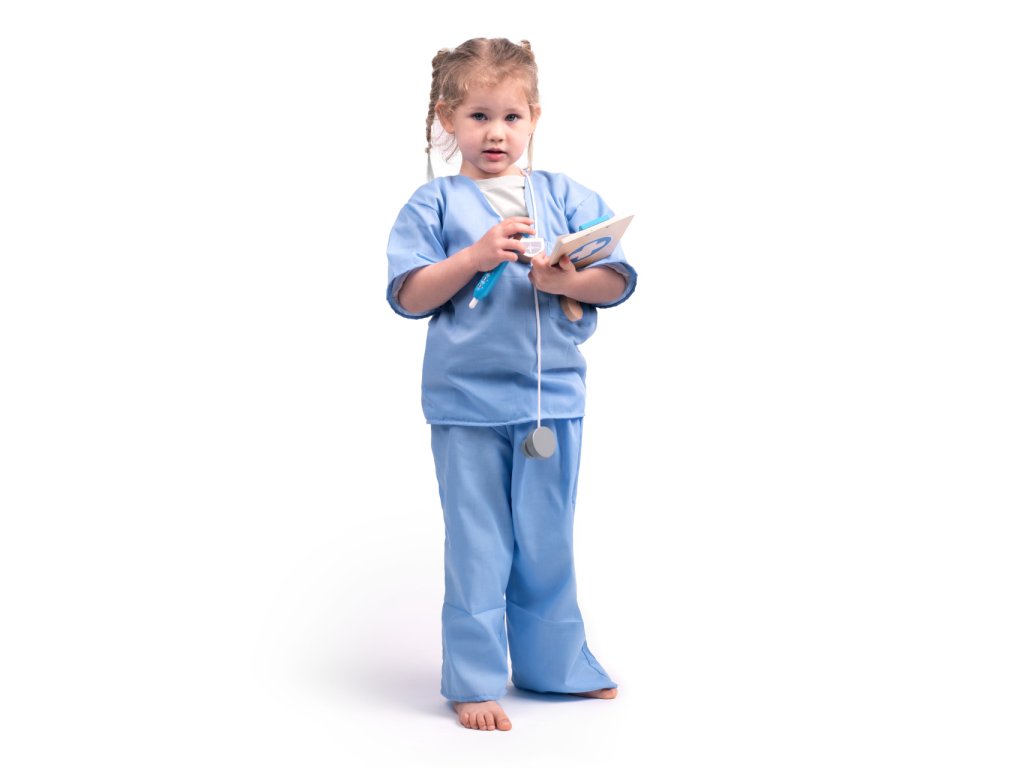 Pomozte dětem ošetřovat medvídky, panenky nebo členy rodiny s tímto realisticky vypadajícím kostýmem zdravotníka pro děti. Součástí tohoto lékařského převleku je modré triko, kalhoty, dřevěný stetoskop, lékařské desky, kde si mohou děti zapsat diagnostické poznámky, teploměr, kapesní hodinky a injekční stříkačka a také náplasti. Suché zipy pro snadné oblékání a svlékání kostýmu. Kostým je vyroben z bavlny a polyesteru, lze prát v pračce. Hlavní vlastnosti: ideální pro ošetřování nemocných medvídků nebo panenekpomáhá s rozvojem představivosti, řeči a sociálních dovedností napomáhá zmírnit strach a obavy z návštěvy lékaře