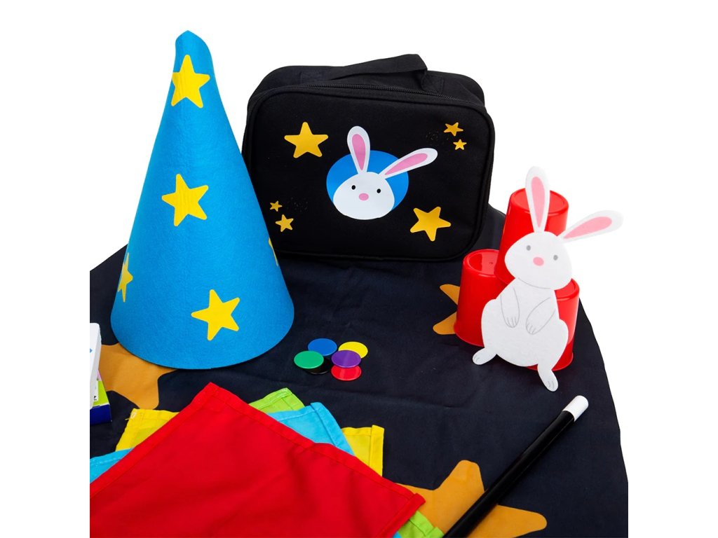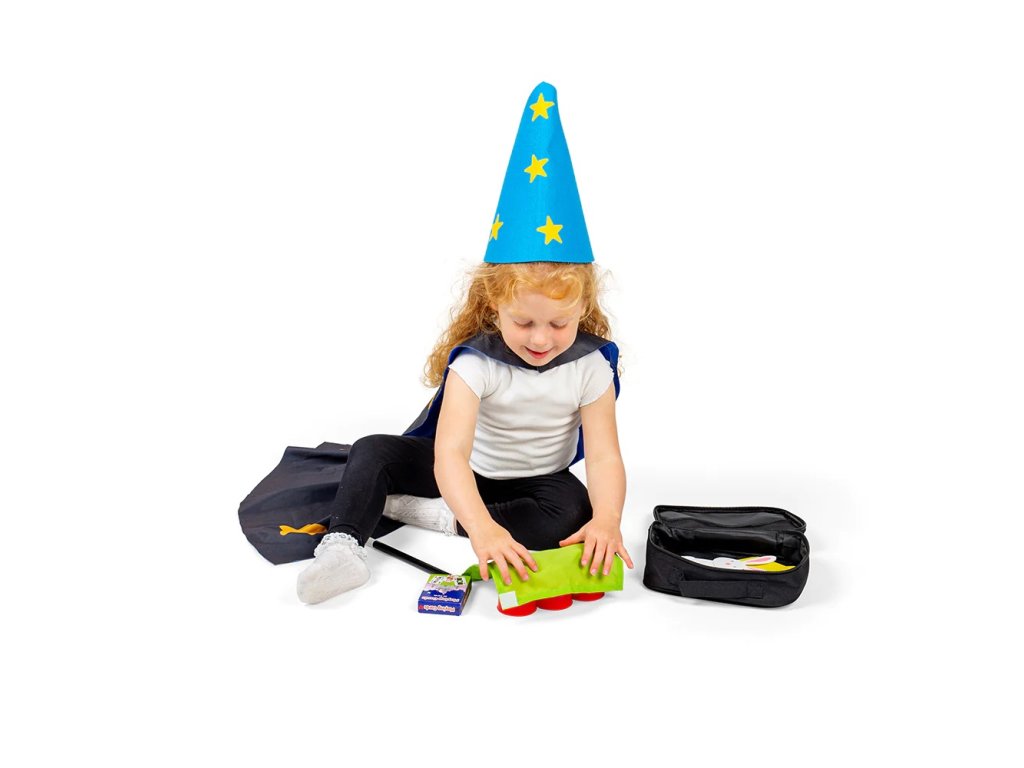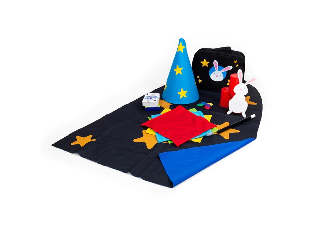 Kouzelnické hračky hravým způsobem zvyšují sebevědomí dětí, sociální dovednosti a jejich představivost. Malí kouzelníci mohou ohromit svými kouzelnickými triky kamarády, rodinu, medvídky, nebo panenky. Tato sada obsahuje kouzelnickou tašku, plášť s hvězdným potiskem, dřevěnou hůlku, karty, 3 plastové kelímky, plstěný klobouk, králíka, 6 plastových žetonů a 4 ubrousky. Ideální pro každodenní zábavu, předstírané hraní a dokonce i párty. Hlavní vlastnosti: 11dílná kouzelnická sadarozvíjí sebevědomí a sociální dovednostinápadité a detailní zpracovánívhodné pro děti od 3 let