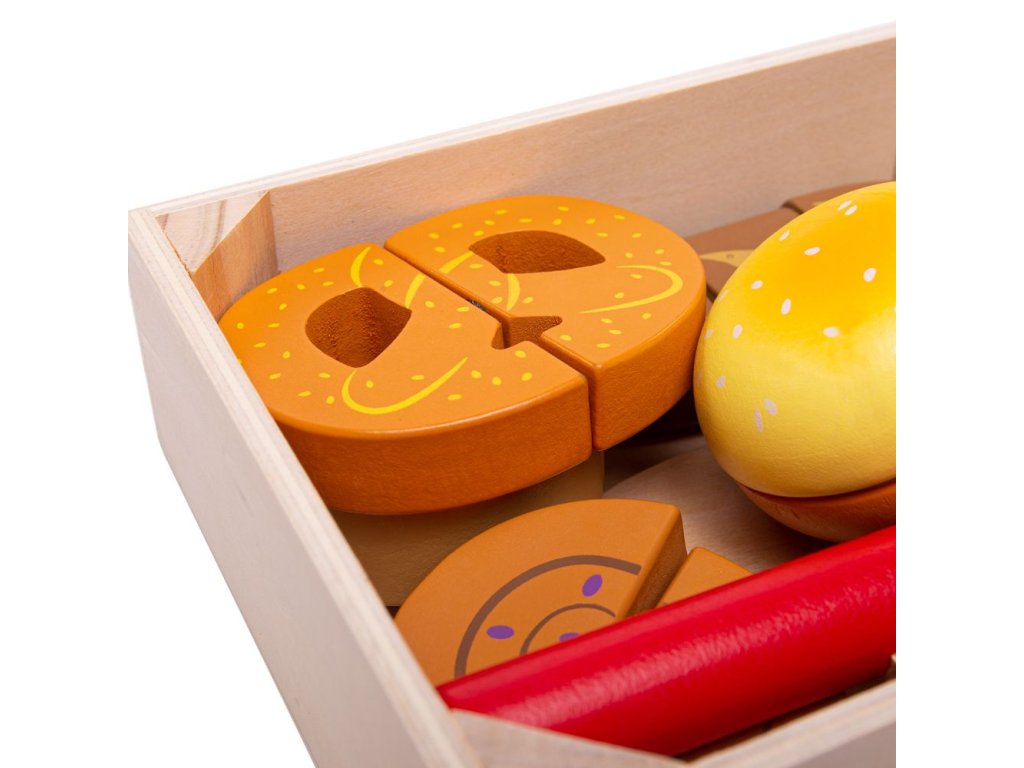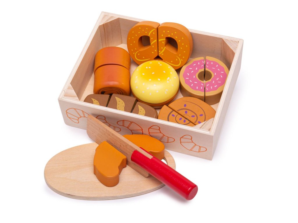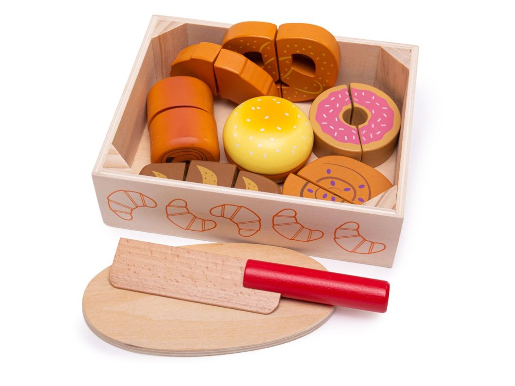Čerstvé pečivo přímo z pekárny. Set obsahuje chutné pekařské lahůdky včetně croissantu, koblihy, chleba a další! Potraviny, které jsou spojeny suchým zipem, je možné krájet pomocí přiloženého dřevěného nože. Skvělý doplněk pro všechny začínající kuchaře. Bigjigs Toys dřevěné jídlo je ideální, aby pomohlo vašemu dítěti dozvědět se o významu zdravé a vyvážené stravy, odkud pochází naše jídlo a jak jídlo připravujeme. Po ukončení hry může dítě dřevěné potraviny uložit do praktické dřevěné krabičky. Hlavní vlastnosti: dřevěné potraviny spojené suchým zipemrozvíjí motoriku dětíučí správnému stravování