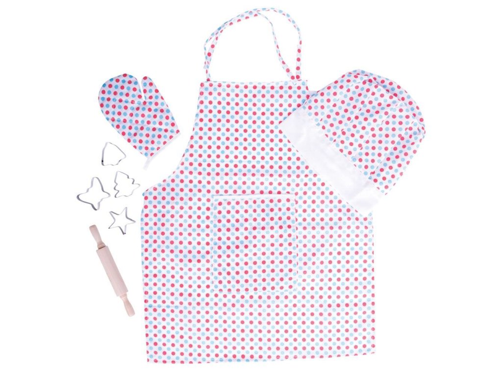 Mladí kuchaři budou milovat tuto světlou puntikovanou bavlněnou sadu k pečení nebo vaření, která obsahuje zástěru, chňapku, kuchařskou čepici, váleček a vykrajovátka. Ideální pro použití v asistovaném vaření nebo pečení, nebo pro použití v našem dřevěném kuchyňském sortimentu, jako součást hracích rolí, které si vaše dítě jistě rádo ztvární. Hlavní vlastnosti: čepice: zapínání na suchý zips, obvod cca 47-51 cmrukavice - délka 17 cmzástěrka - délka: bez šňůrek 56 cm + šňůrky 29cm, šířka 46 cm + každá šňůrka 42 cm