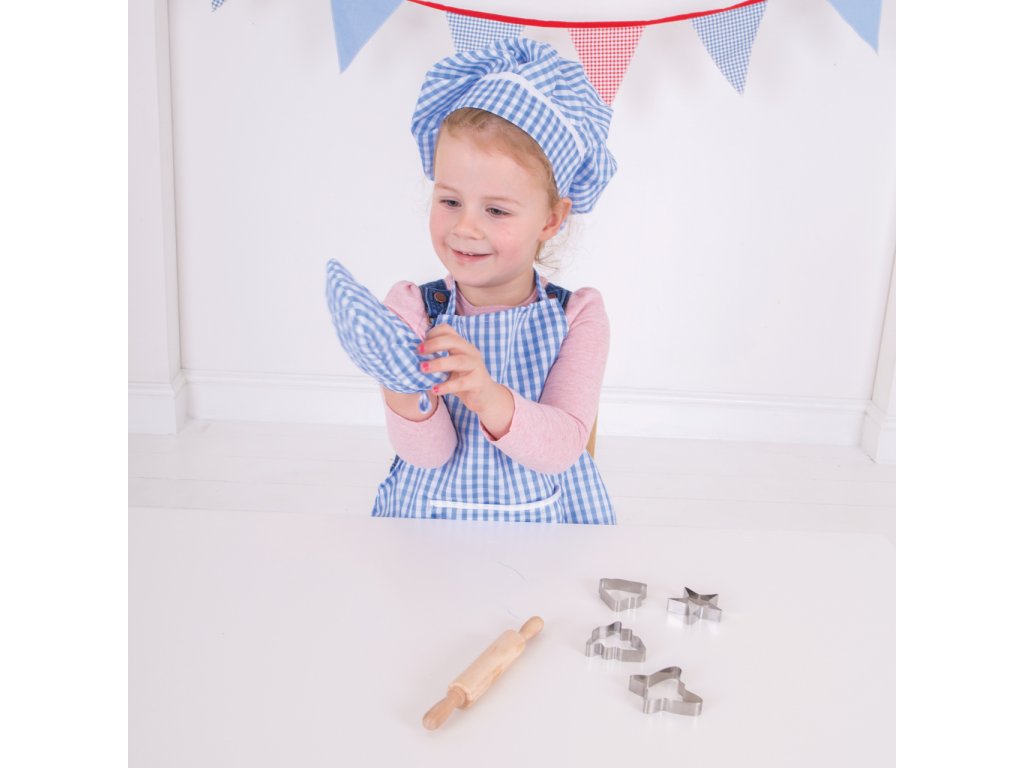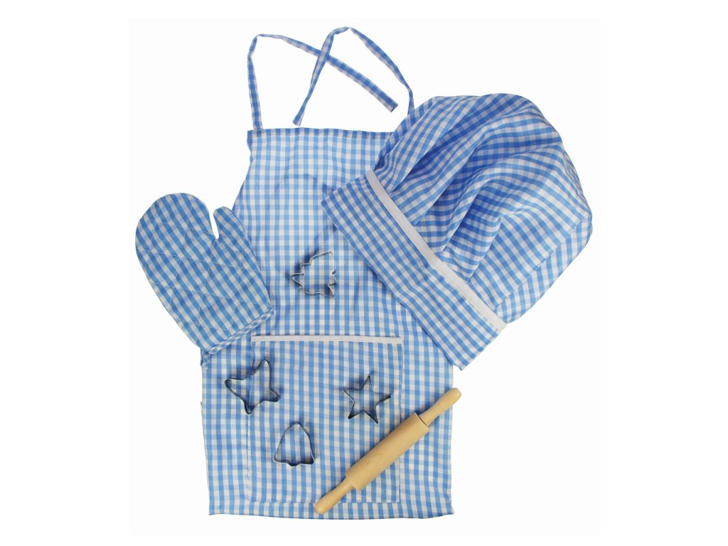 Mladí kuchaři budou milovat tuto světlou a příjemně modrou bavlněnou sadu k pečení nebo vaření, která obsahuje zástěru, chňapku, kuchařskou čepici, váleček a vykrajovátka. Ideální pro použití v asistovaném vaření nebo pečení, nebo pro použití v našem dřevěném kuchyňském sortimentu, jako součást hracích rolí, které si vaše dítě jistě rádo ztvární. K dispozici také v růžové barvě zde. Hlavní vlastnosti: čepice: zapínání na suchý zips, obvod cca 47-51 cmrukavice - délka 17 cmzástěrka - délka: bez šňůrek 56 cm + šňůrky 29cm, šířka 46 cm + každá šňůrka 42 cm