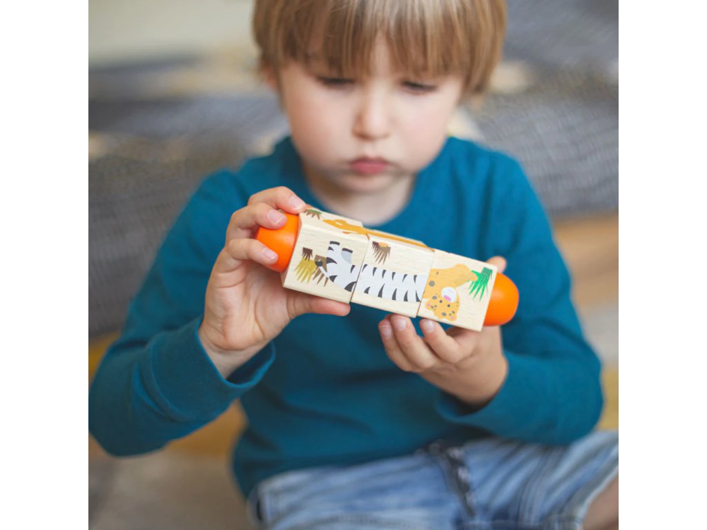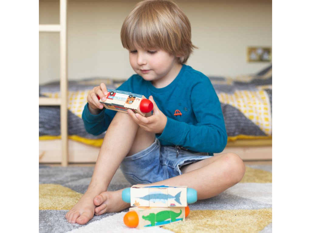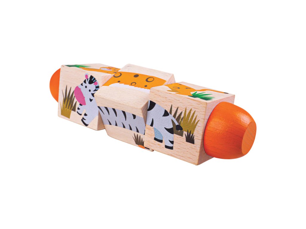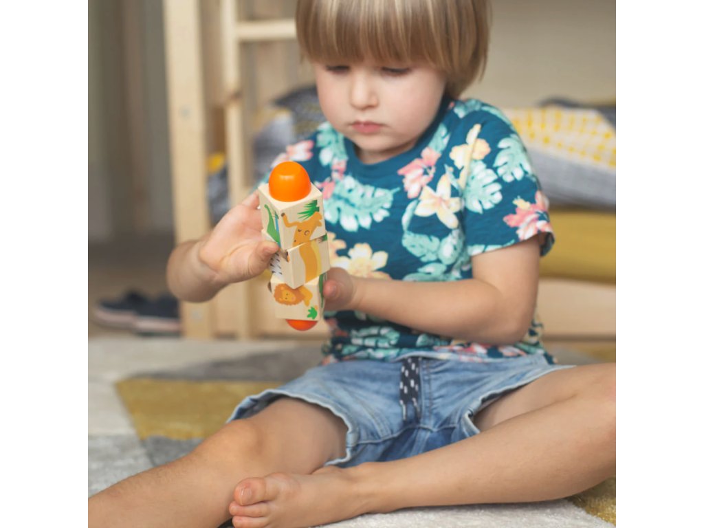 Tvořivé děti budou rády otáčet a kombinovat kostky tak, aby sestavily obrázková zvířata. Spojte ty stejné, nebo obrázky promíchejte a vytvořte nové bláznivé auto. S více než 60 kombinacemi zábava nikdy nekončí. Skvělá a jednoduchá hračka. K dispozici ve dvou dalších motivech: život v moři a doprava. Vyrobeno z vysoce kvalitních materiálů ze zodpovědných zdrojů. Vyhovuje současným evropským bezpečnostním normám. Hlavní vlastnosti: rozvíjí motorické dovednosti, rozpoznávání tvarů a barevkompaktní a odolné provedení