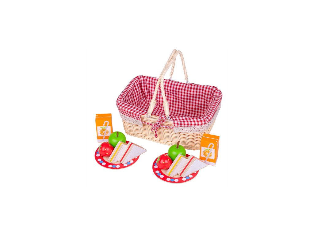 Tradiční piknikový košík naplněný vším potřebným. Obsahuje dřevěné sendviče, jahody, jablka a pomerančová fruika. Proutěný košík také obsahuje talířky a deku na piknik. Děti tak mohou piknikovat se svými plyšáky nebo vyrazit do parku s rodinou a přáteli. Perfektní hračka pro interaktivní hru. Učí děti o důležitosti zdravé a vyvážené stravy. Podporuje je v kreativním a představivém hraní na role. Vyrobeno z kvalitních materiálů z odpovědných zdrojů. Odpovídá evropské bezpečnostní normě. Hlavní vlastnosti: košík se všemi náležitostmi k piknikuvhodné pro interaktivní hrupodporuje kreativitu a představivé myšlení