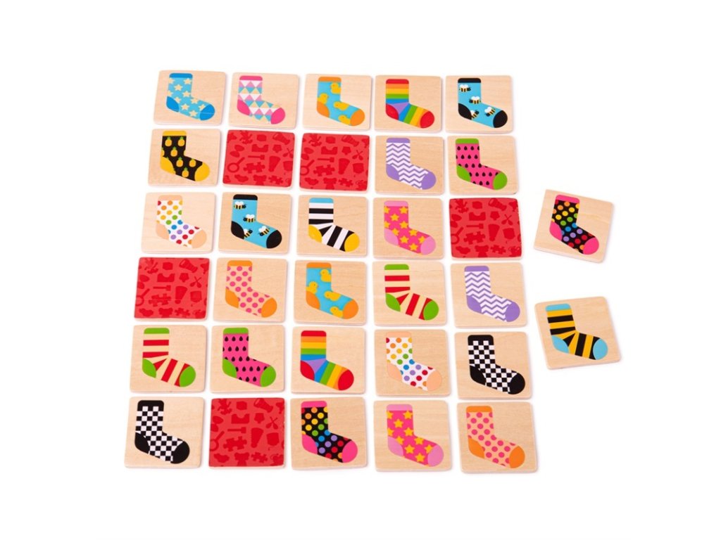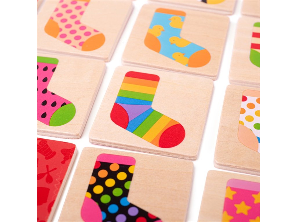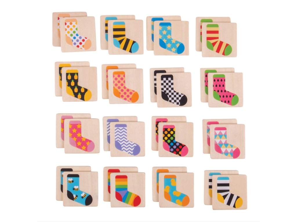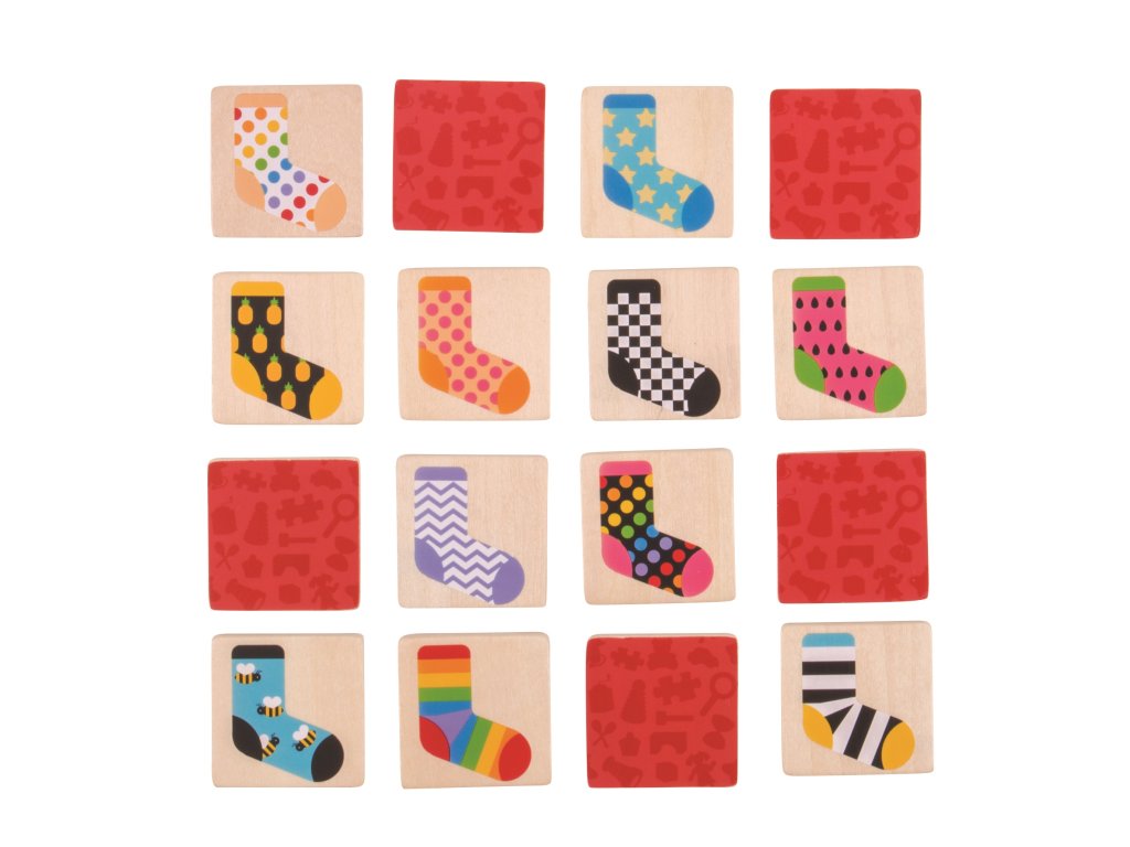 Tato hra s ponožkami určitě otestuje paměť a pozorovací schopnosti dětí! 32 dřevěných dílků je umístěno lícem dolů na stůl nebo podlahu. Hráči se musí střídat a otáčí vždy dva dílky. Pokud se shodují, hráč si ponechá tento pár ponožek a otočí další dvě, přičemž pokračuje, dokud se obě otočené destičky neshodují – pak je na řadě další hráč. Hráč s největším počtem párů na konci hry je vítěz! Tím zábava nekončí... Skvělý způsob, jak rozvíjet koncentraci, paměť a pozorovací schopnosti. Podporuje interaktivní hry a rozvíjí slovní zásobu. Učí děti obratu a strategii. Vyrobeno z vysoce kvalitních, zodpovědně získaných materiálů. Splňuje aktuální evropské bezpečnostní normy. Skládá se z 32 hracích dílků. Hlavní vlastnosti: obsahuje 32 dílkůzlepšuje paměť a pozorovací schopnostivyrobeno ze dřeva