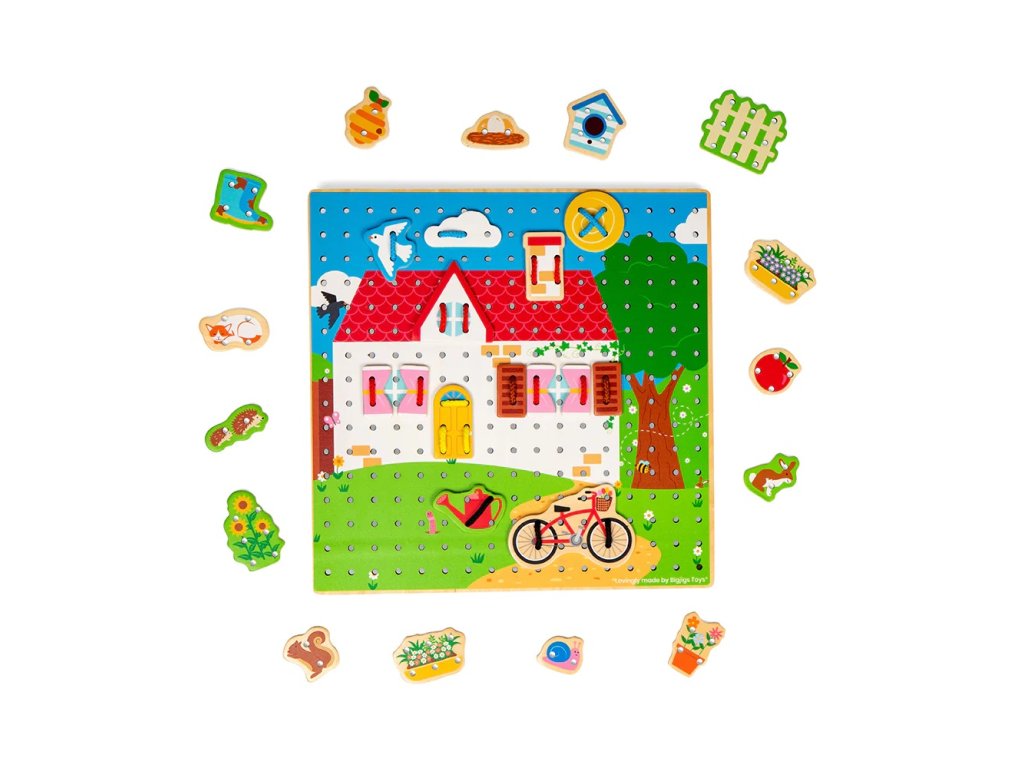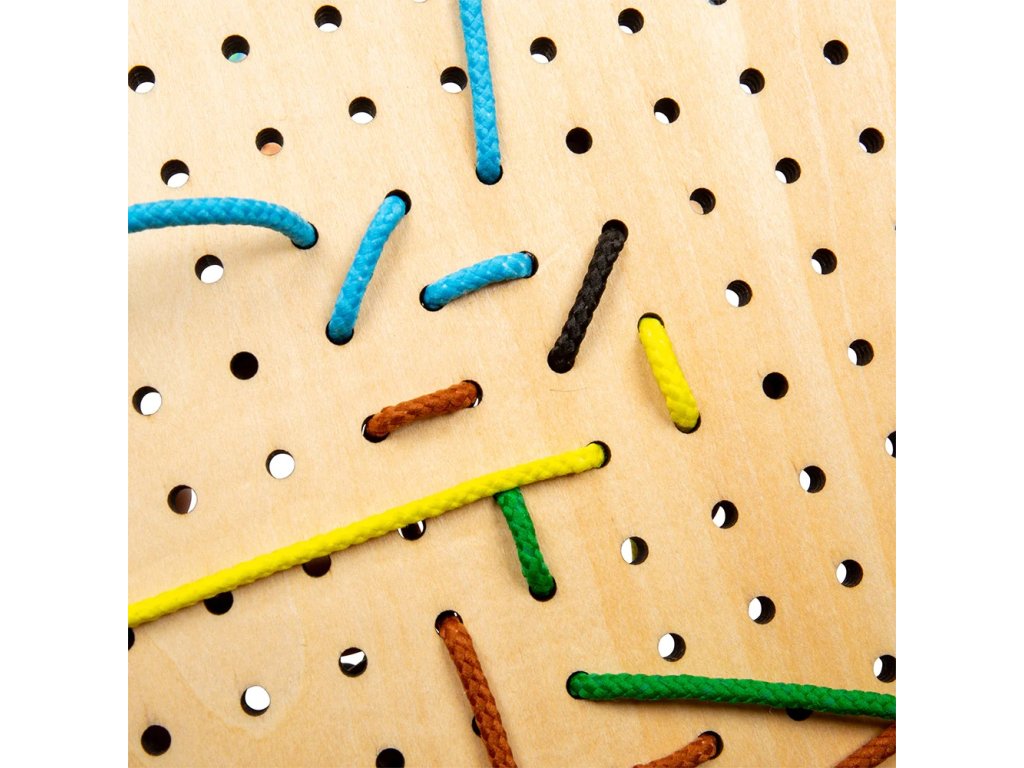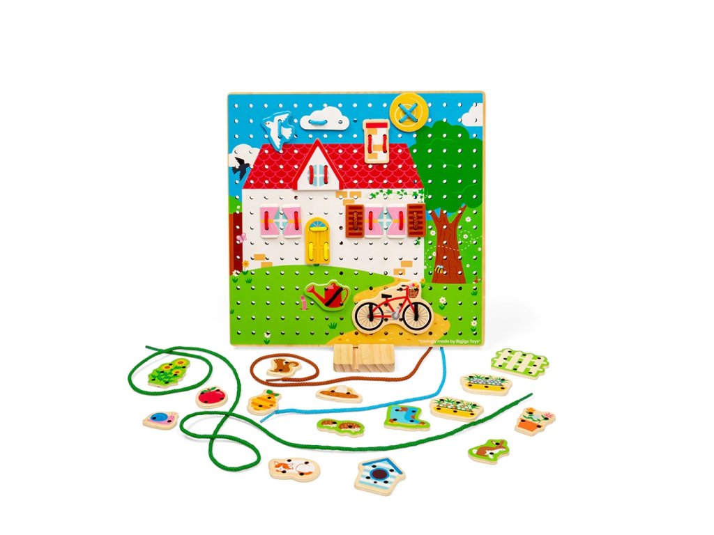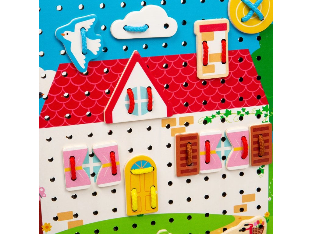 Provlékací domeček je šněrovací hra plná zábavy. Pomocí barevných provázků dítě provléká skrz dřevěnou desku s otvory kousky motivů, jako jsou okna, kolo, oblak a další. Může si tak obrázek vytvořit na spoustu různých variant. Jasné zářivé barvy jsou ideální pro stimulaci představivosti. Tato zábavná provlékací hračka poskytne vašemu děťátku hodiny zábavy. Je to skvělý způsob, jak rozvíjet u vaší ratolesti koordinaci pohybů, jemnou motoriku, zručnost a trpělivost. Vyrobeno z vysoce kvalitních, zodpovědně získaných materiálů. Splňuje aktuální evropské bezpečnostní normy. Hlavní vlastnosti: 30 dílů, 6 ks tkaničekkrásné barevné zpracovánírozvíjí jemnou motorikuvhodné od 3 let